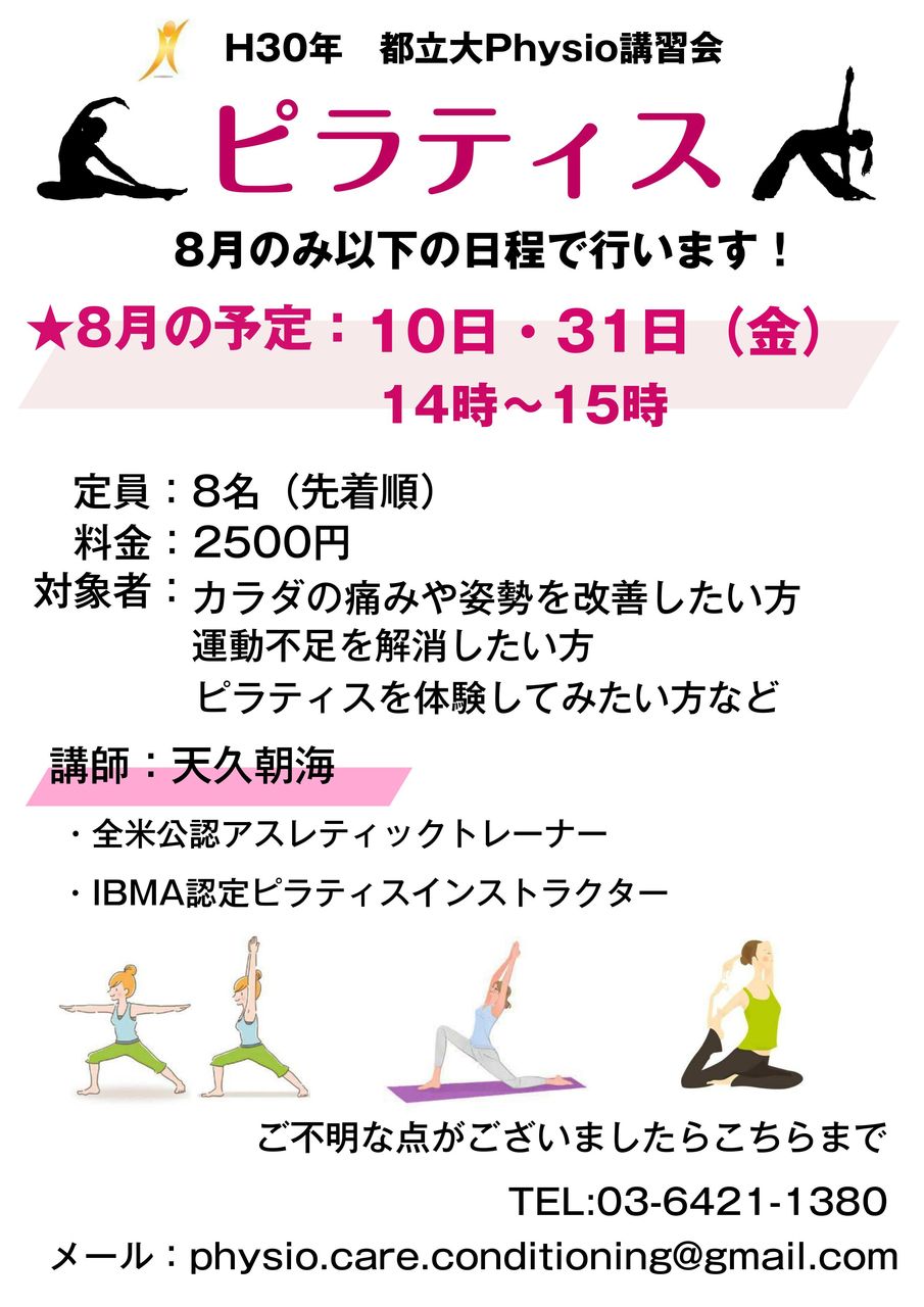 2018年07月21日 8月ピラティス 日程変更のお知らせ こんにちは!先日ご案内いたしました、8月のピラティスの日程が変更になりましたのでご案内いたします。8月のみ、以下の日程で行うことになりましたのでご確認のほど宜しくお願い致します。