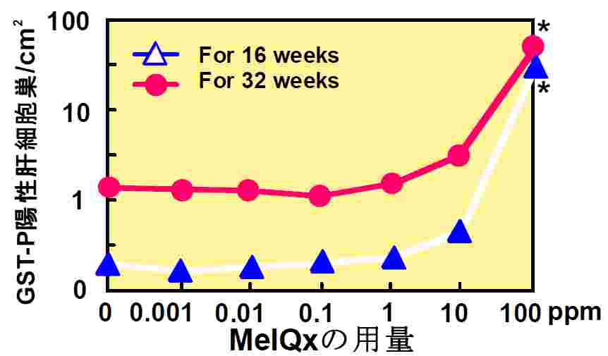 発癌物質も、ある量以上を摂取したときに癌化を促進するそうで、肉の焼け焦げに含まれるヘテロサイクリックアミン(MelQx)の具体量が示されました。