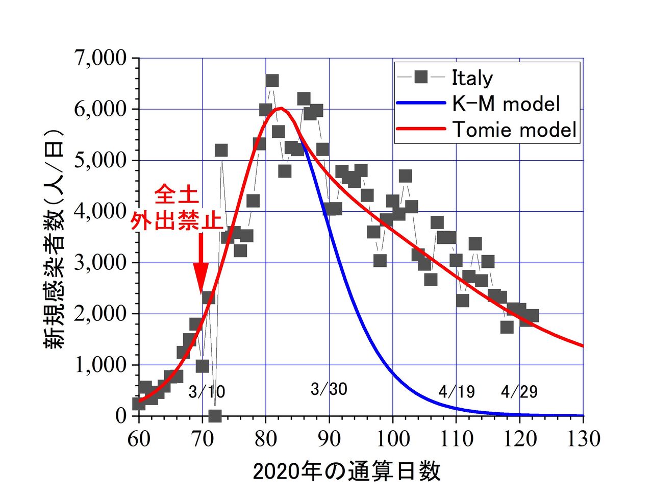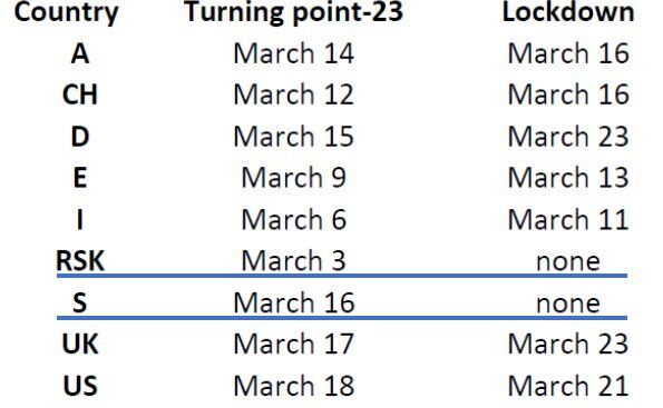 発症までの潜伏期を5日、発症から死までを18日と仮定し、死に至る感染が最大になった日を求め、ロックダウンは、どの国でも手遅れだった、と論じています。
