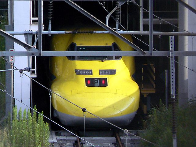 ドクターイエローT5編成は車庫の中、T4編成は陸橋反対側に留置していました。