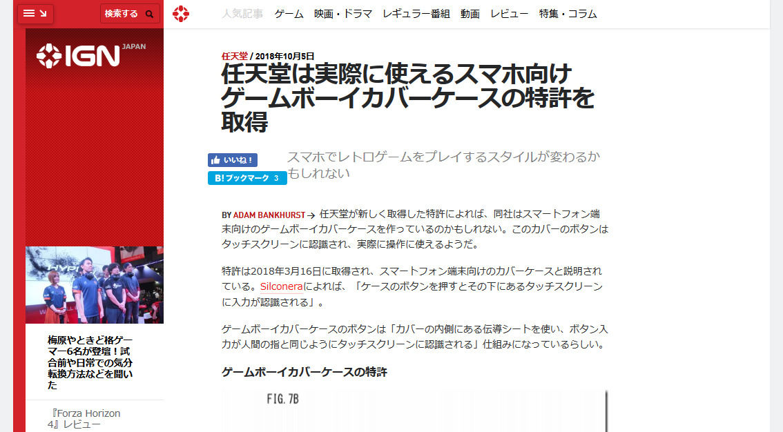 ・特許は2018年3月16日に取得され、スマートフォン端末向けのカバーケースと説明されている。Silconeraによれば、「ケースのボタンを押すとその下にあるタッチスクリーンに入力が認識される」。
