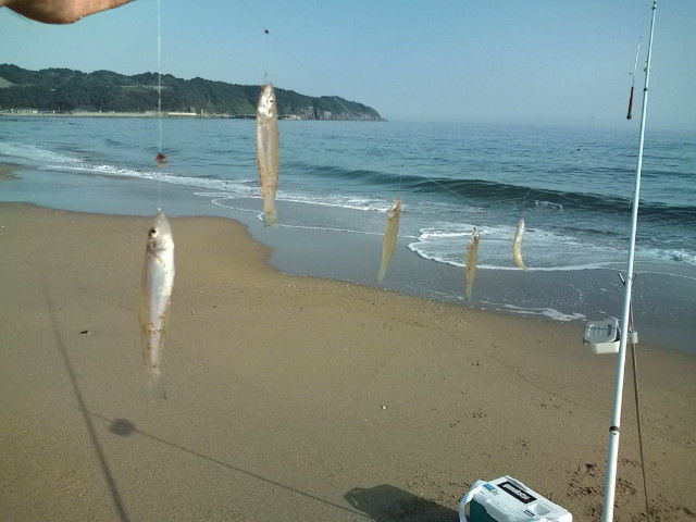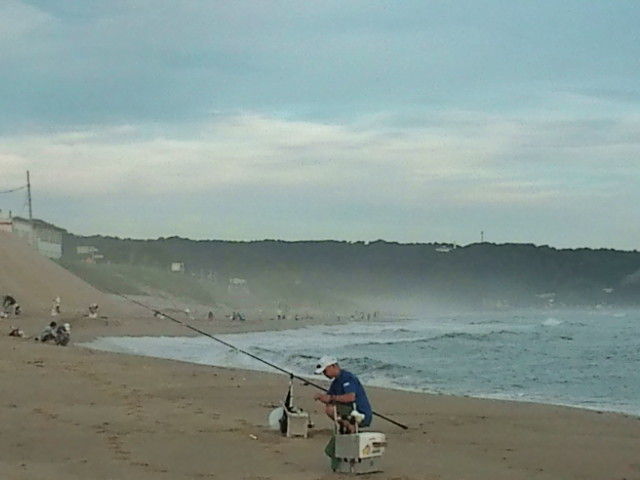 波は昨日の半分ぐらい?かな、釣れそうな気配ガンガンです。浜にはすでにお知り合いの方々が4人ほどいらっしゃいます。状況を聞いてみると、え〜っ、釣れてない?マジで〜?
