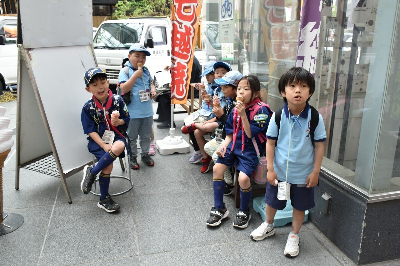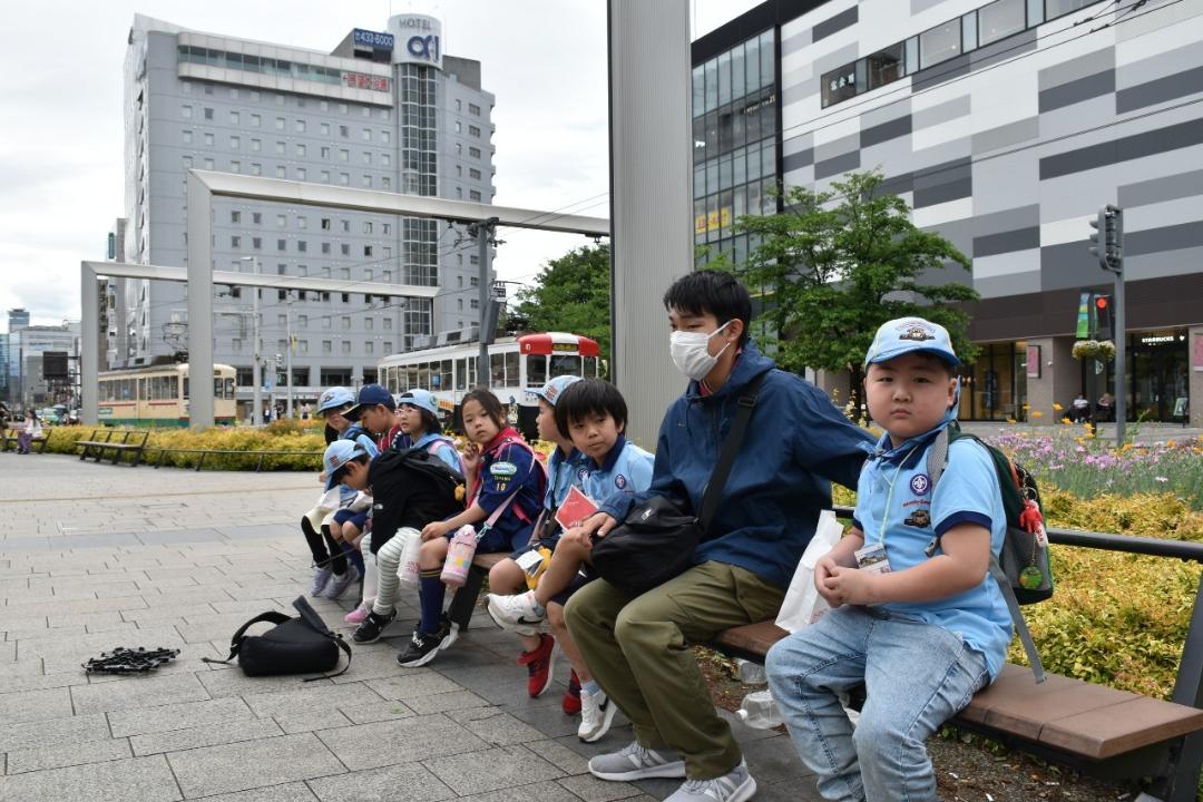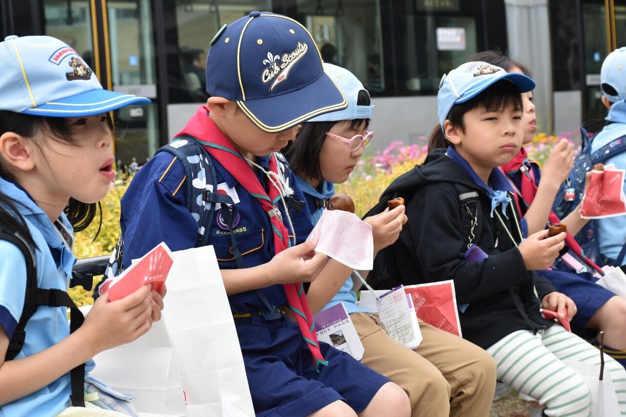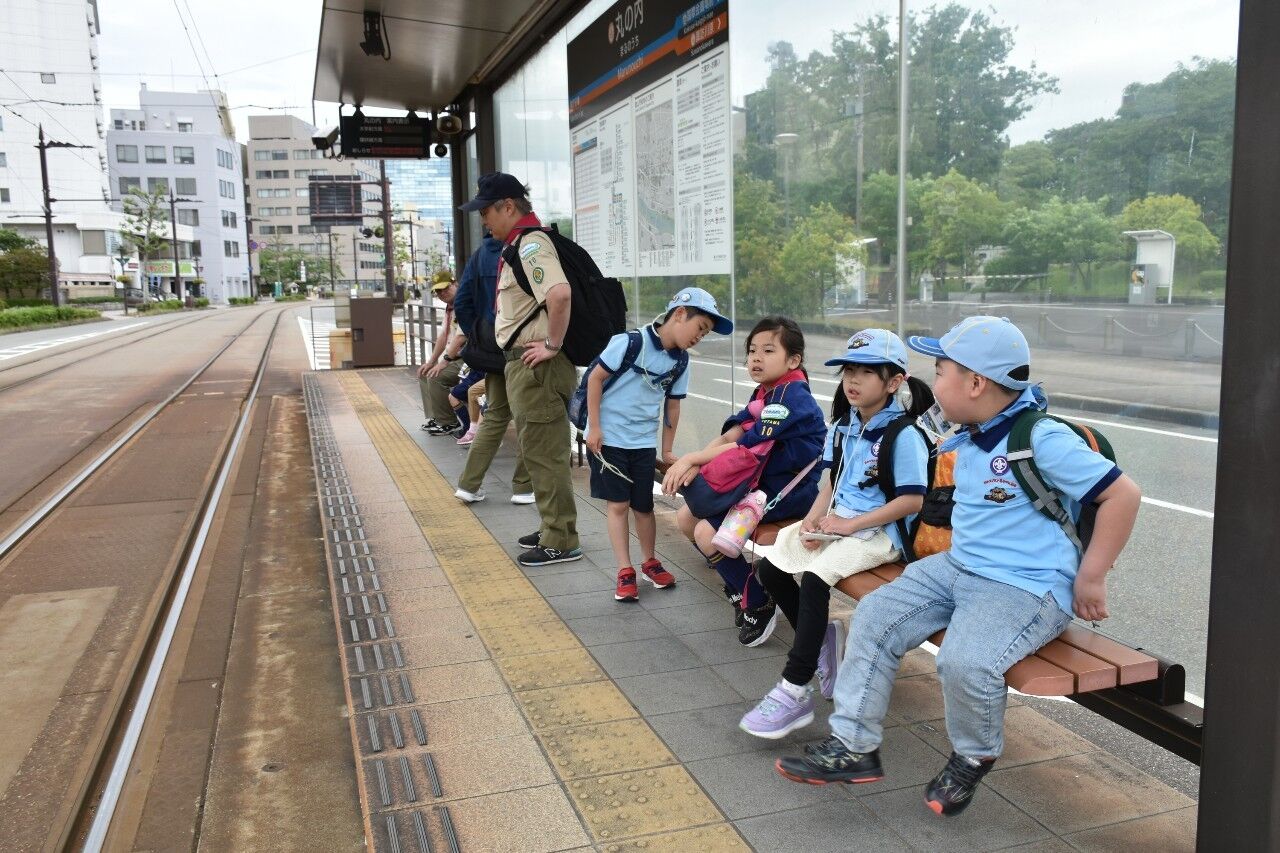 5月12日日曜日の隊活動は「げんきじ電車でGO!ミステリーツアー」です。朝9時南富山駅に集合。市電に乗って市内環状線をお買い物しながら一周しました。7名のスカウトがキチンと並んでお座り。市電まわる探検&お買い物。①富山市役所の展望台から会社の社名探し②MAROOTでかりんと饅頭(母の日・お母さんの分も一個購入③川上のますのすし④グランドプラザの七越しでソフトクリームを購入、カードに母の日感謝の気持ちを書いてかりんと饅頭といっしょにお母さんに渡しました。19日日曜日はボーイスカウト富山県大会。みんなげんきに参加してね!