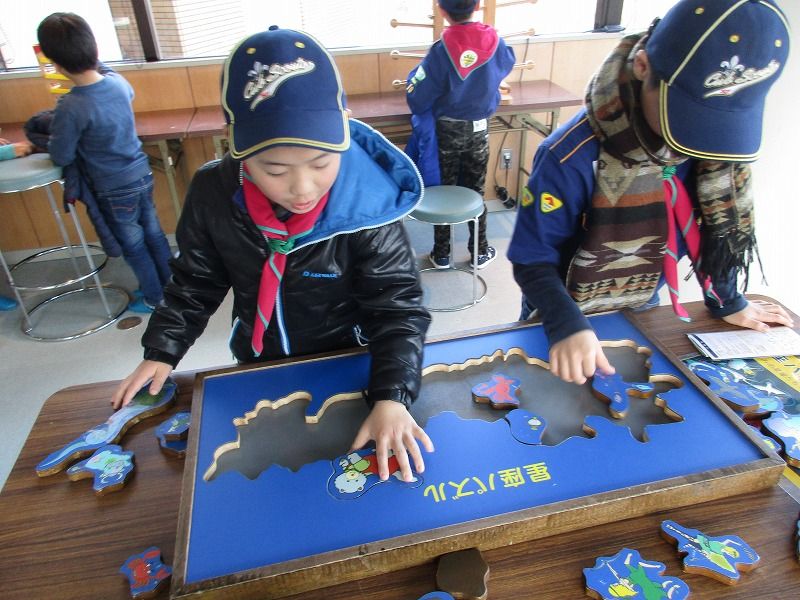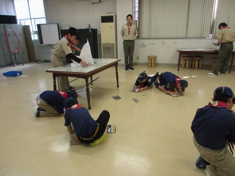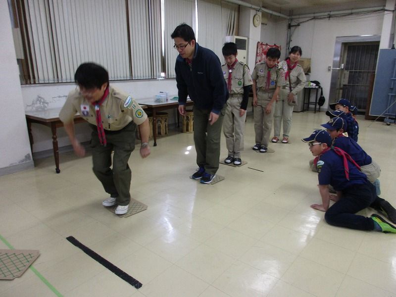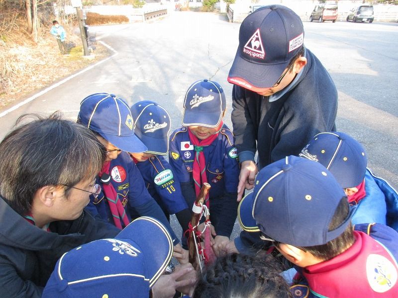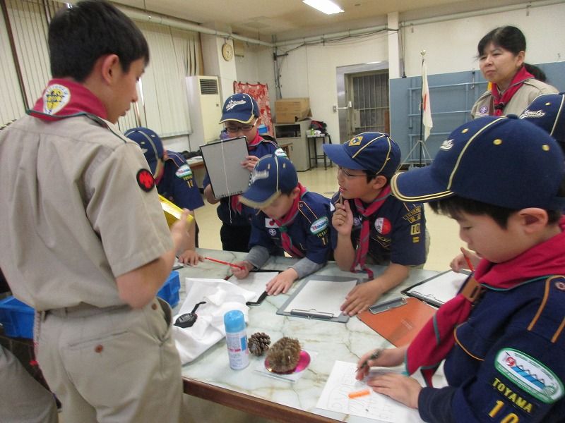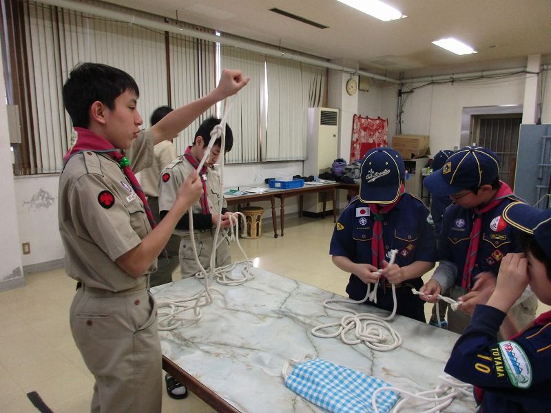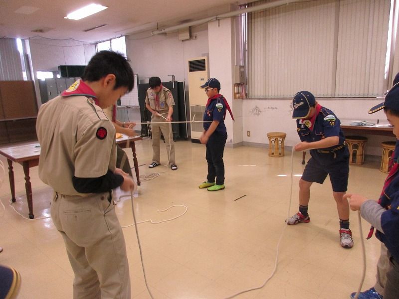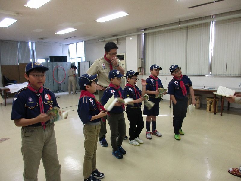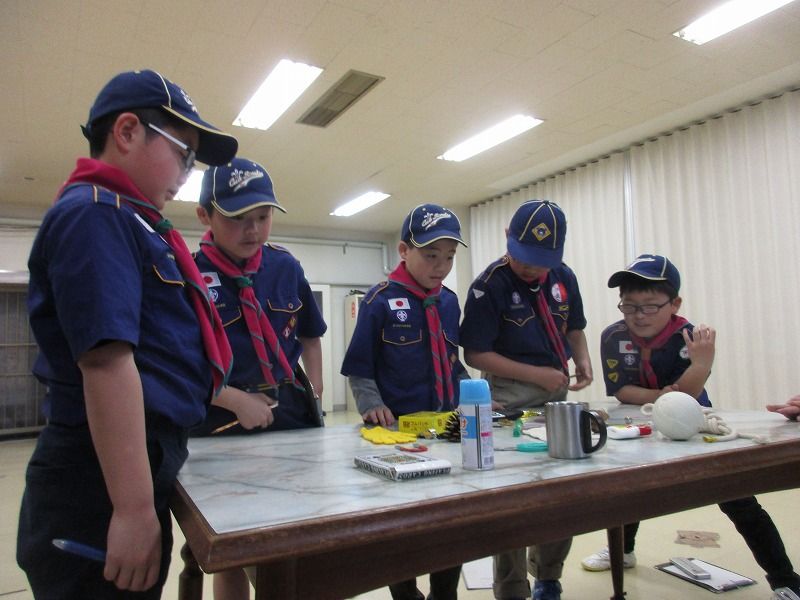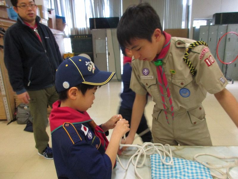 今年度最後の隊集会は、ビーバーから上進してくるスカウトにプレゼントのチーフリング作り、ボーイ隊へ上進する組長にありがとう!10月からのデンコーチに感謝する日でした。ソングは カブ隊のモットー「いつも元気」と「毛虫が三匹」の輪唱、ギャ!ぎゃ!と楽しく歌い、次はキムスにロープ、進行はもちろんデンコーチです。24個はなかなか難しい~~でも最高は18個の正解が出ました。チーフリング作りはトントン楽しく素敵な作品になりました。組長、デンコーチありがとうのお茶会はBPで