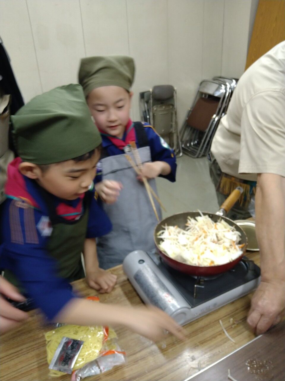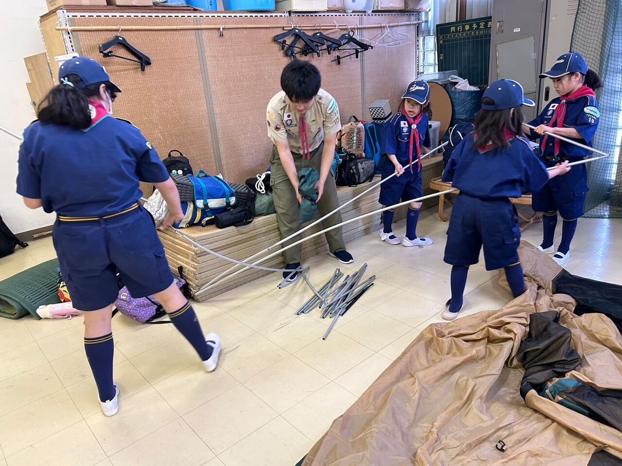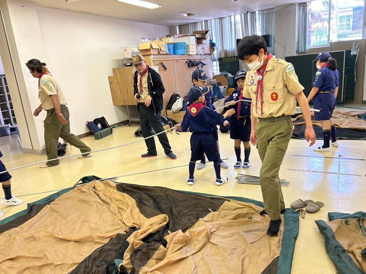 来月は、1泊野営、8月は2泊の団合同野営です。テントは立てれるかな?、食事は作れるかな?ということで、5月4日、5日はスカウトハウスで1泊の舎営を行いました。みんな協力して実に楽しい時間を過ごしました。テントを立てて、夕食をつくり、みんなでウインディへお風呂に入りに行きました。