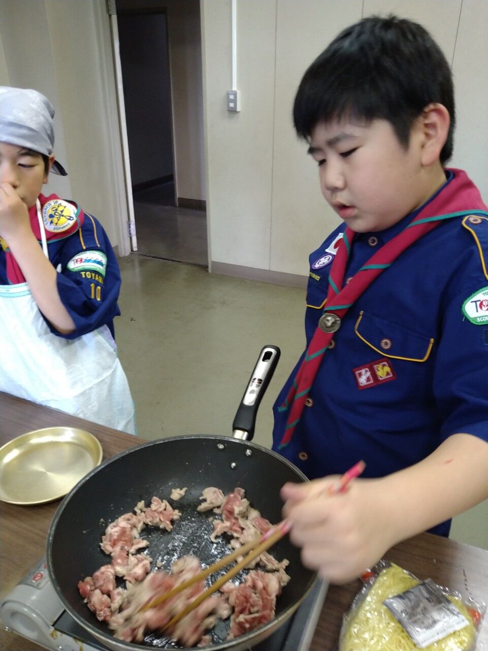 夕食つくりが始まりました。最初は、お肉を炒めます
