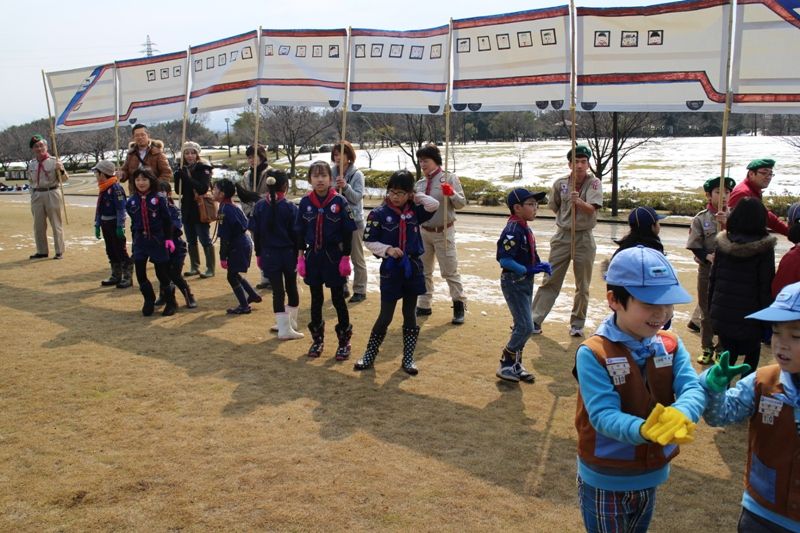 20153月14 かがやきでGO!!プロジェクト(富山市稲荷公園) ボーイスカウト富山県連盟行事「かがきでGO!!」に参加。富山市稲荷公園で10時~11時まで上下4本の新幹線をお出迎えしました。新幹線の乗客が窓から手を振って応えてくれました。次の新幹線が来る間に笠島カブ隊長が新幹線のお勉強!!