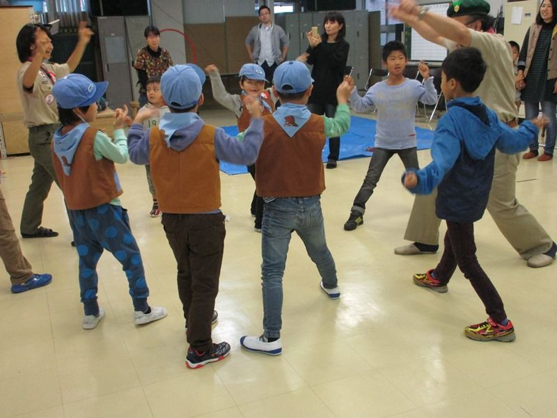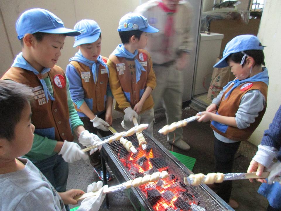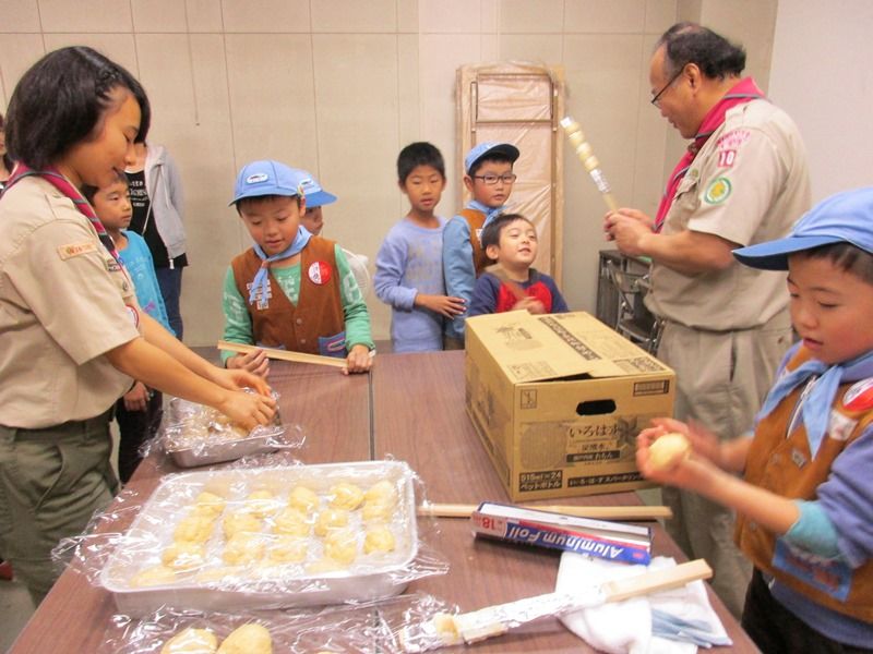 201511月15 ビーバー集会のお手伝い 15日のビーバー集会は2名の入隊式。浅生団委員長も出席していただいてお祝いの言葉をいただきました。アートとまきまきパン、一緒に楽しく過ごしました。団の活動を支援するのもベンチャースカウトの大切な役目ですね。前回のビーバーラリーで覚えたシュウマイじゃんけん。「しゅまい、しゅうまい、じゃんけん・・・・・」手と足を使ったアート作品の製作、ビーバーの面倒見るはずのベンチャー、自ら夢中になってしまいました。いよいよ、ツイストパン作りです。あっという間に焼けました。「味は?」 「美味しいに決まっている!!」