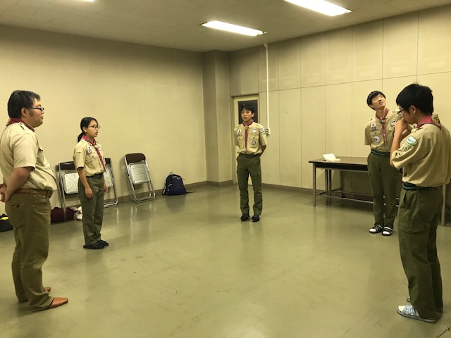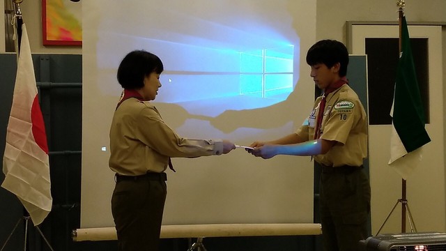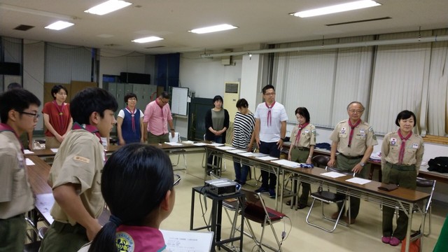 ベンチャースカウト、ボーイ隊のグリーンバー、指導者が参加、団委員長からお餞別の伝達