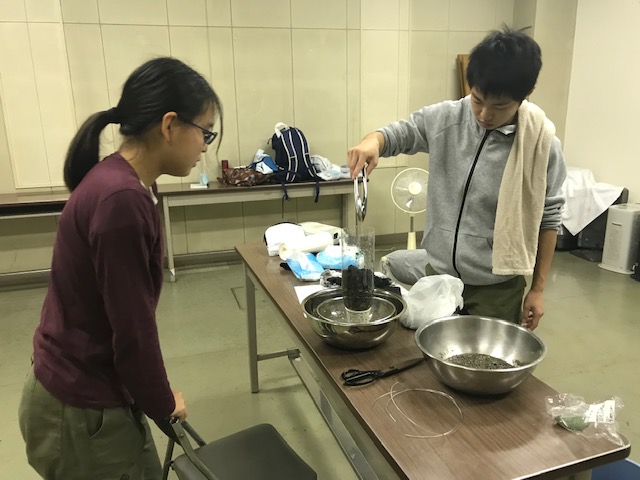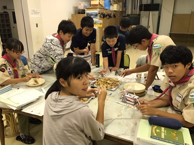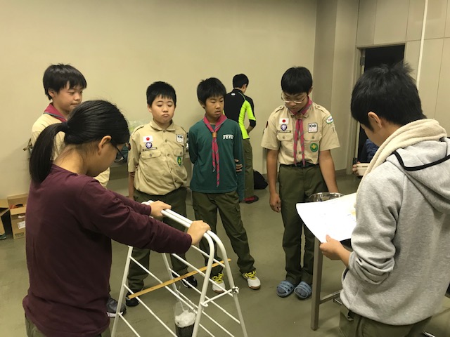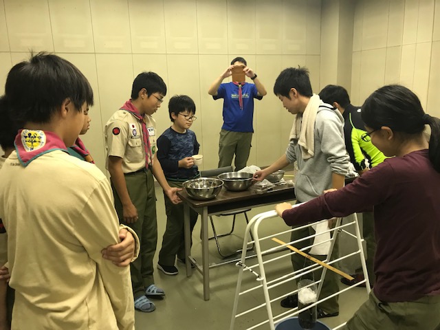 12日13日は大島キャンプ場でのキャンプの予定が大型台風19号の為、スカウトハウスで舎営に変更です。初日は簡易濾過器作りを行い、ボーイ隊にも見てもらいました。