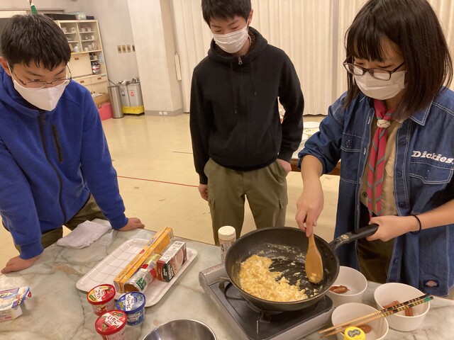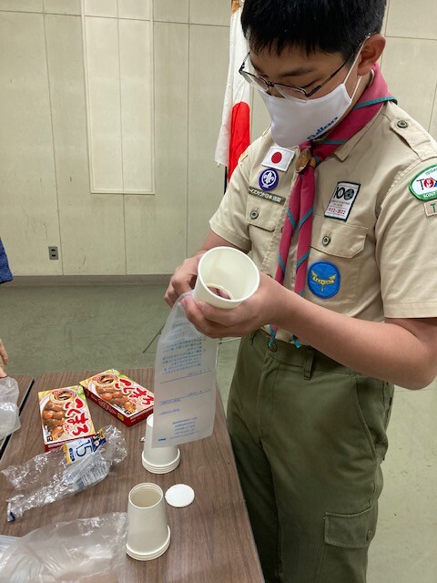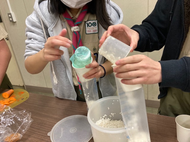 20213月7 3月度ベンチャー隊活動 各高校の試験、そして受験も終わり久しぶりに5名が揃いました。新しいハンドブックが届き、県大会の話、災害時の炊き出し、防災についてなど笑い声と共に、2時間半はあっという間でした。久郷君待ちの間に、ハイゼックスを使いカレーつくりです前回ボーイ隊で経験済なので、説明係です調理?開始です洗ってあったお米を入れます写真を撮り忘れたので、ボーイ隊のを載せました全員揃ったので、開会セレモニーです高校受験合格おめでとう!!カレーができました(^^)/食事後は、県大会の説明とコース選び、次回まで時間とどこを回るか、を検討してくる課題が出ました。閉会セレモニーおきての唱和,もっとう、スローガンで解散