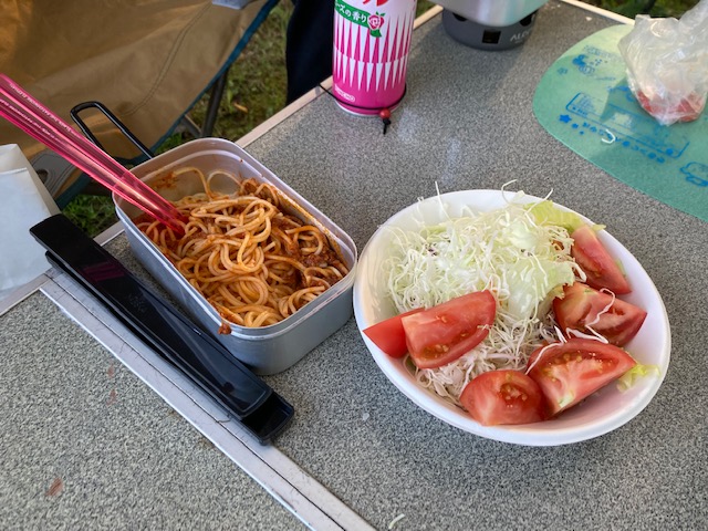 夕食のメニューは大きな鯖缶スパゲティ