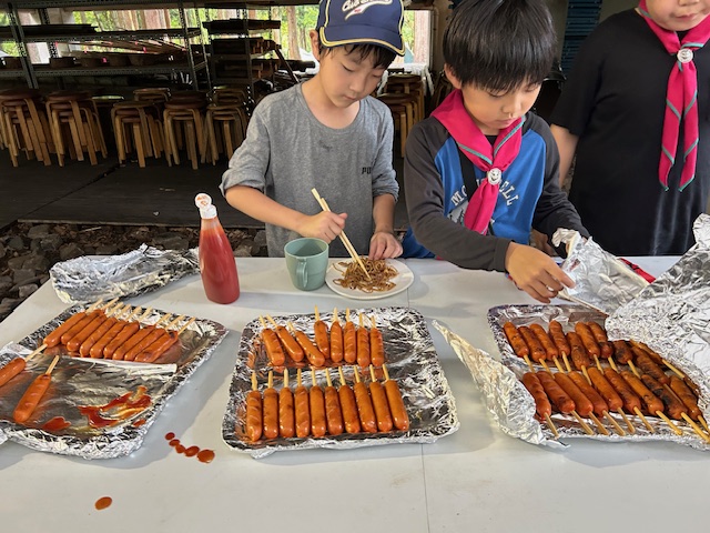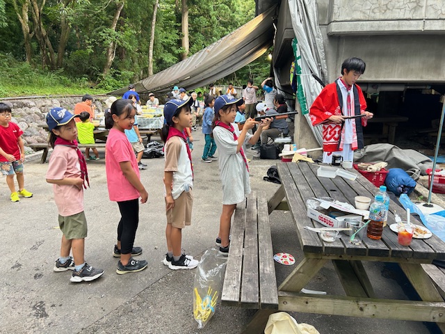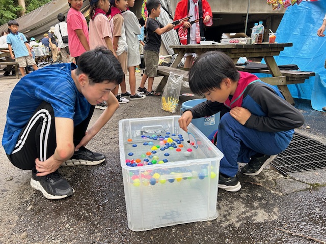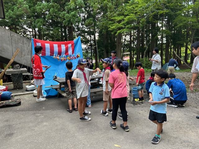 から、始まりました。二日目のお祭り広場は、各隊で作った料理もビーバー隊長のゲームコーナーも