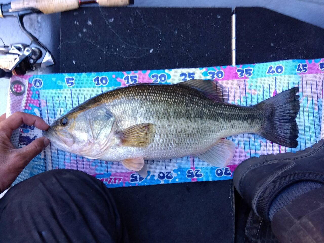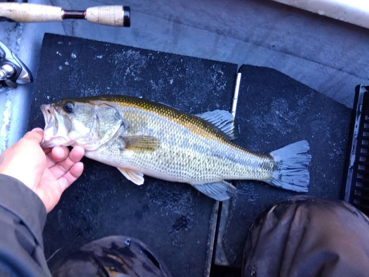 苦しい展開でしたが、11:50頃に岩盤+レイダウンの水深2mにて何とか1165gをキャッチ