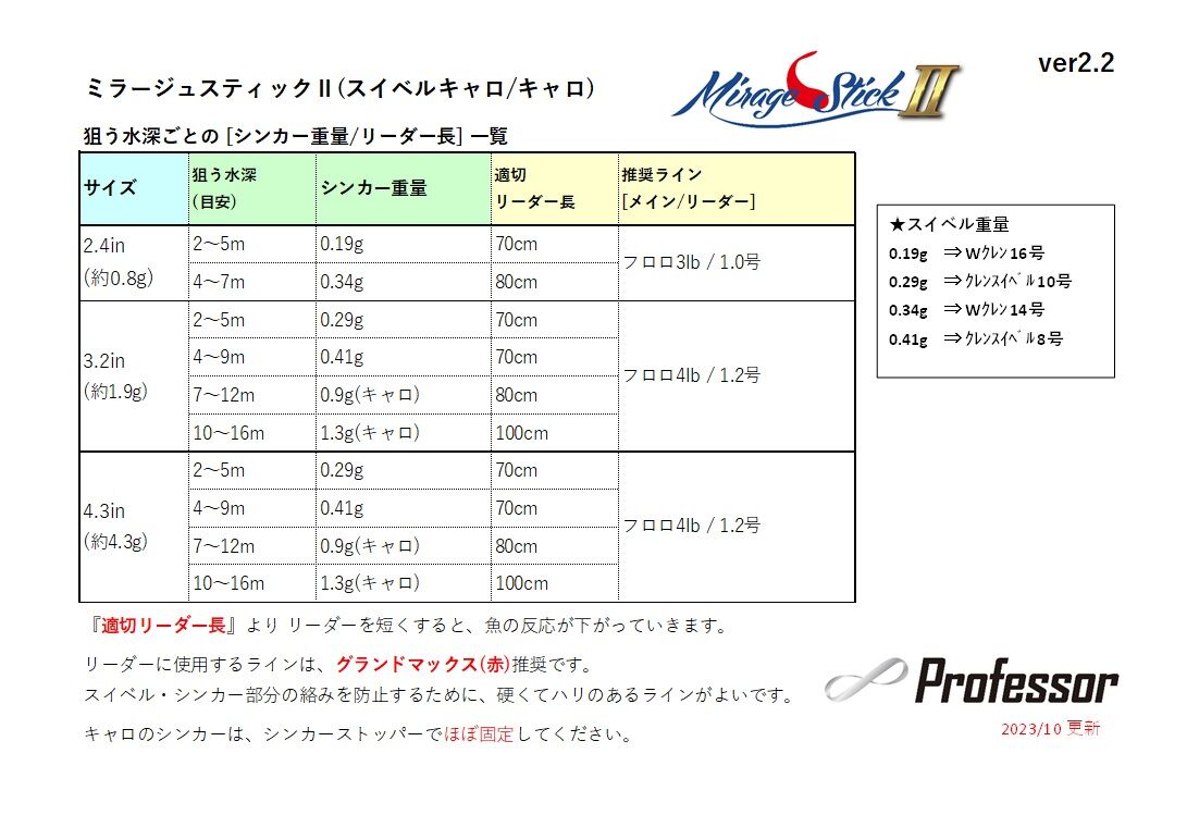 私が相模湖・津久井湖・亀山ダム等 にて使用している、ミラージュスティックⅡ(スイベルキャロ・キャロ)の 狙う水深ごとの シンカー重量・リーダー長 の詳細をご紹介します。