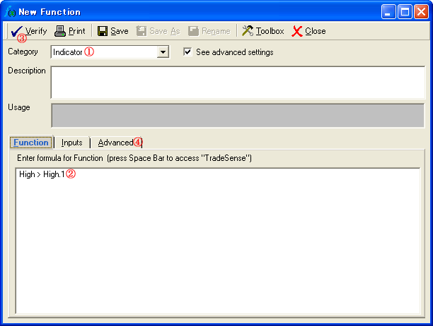 ¡¤ò"indicator"¤òÁª¤Ó¡¢¢¤ËÎã¤Î¡ÉHigh > High.1¡É¤òµ½Ò¤·¡¢£¤Çǰ¤Î¤¿¤á¤Ë³Îǧ¤·¤Æ¤«¤é¤¤Î¥¿¥Ö¤ò¥¯¥ê¥Ã¥¯¤·¤Þ¤¹¡£