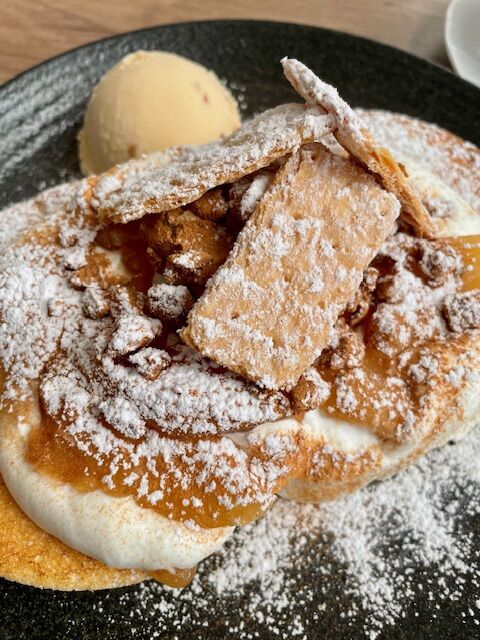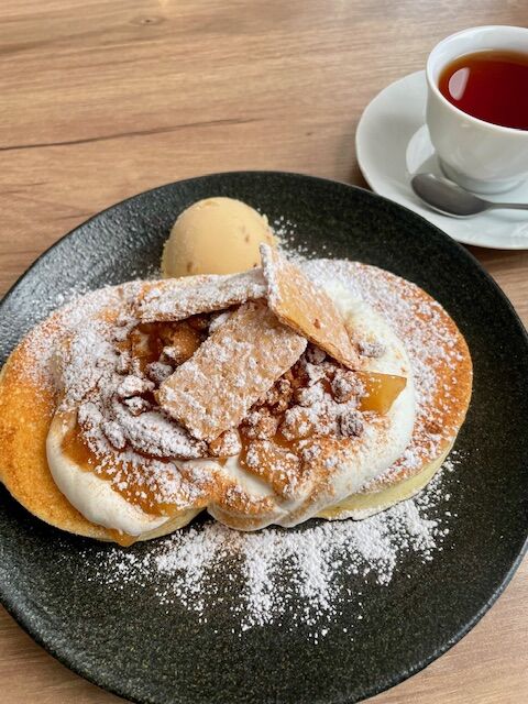 そこで達成感とともに味わったのが、期間限定のアップルシナモンキャラメルパンケーキです。