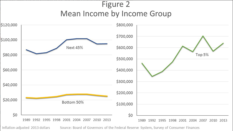 トップ5%世帯の平均所得は1989年から2013年にかけて38%も増えたのに、残り95%世帯では10%未満の伸びにとどまった。