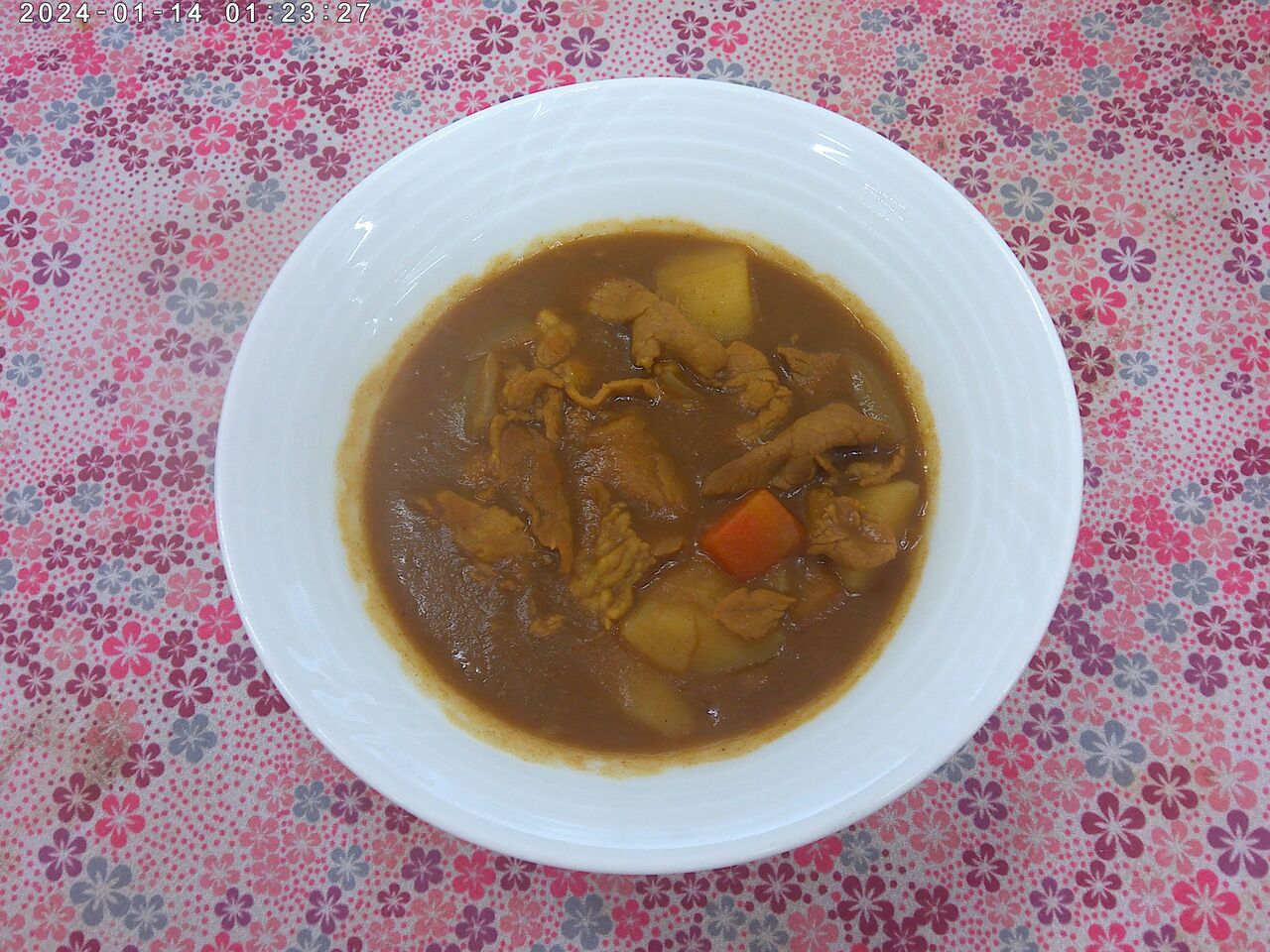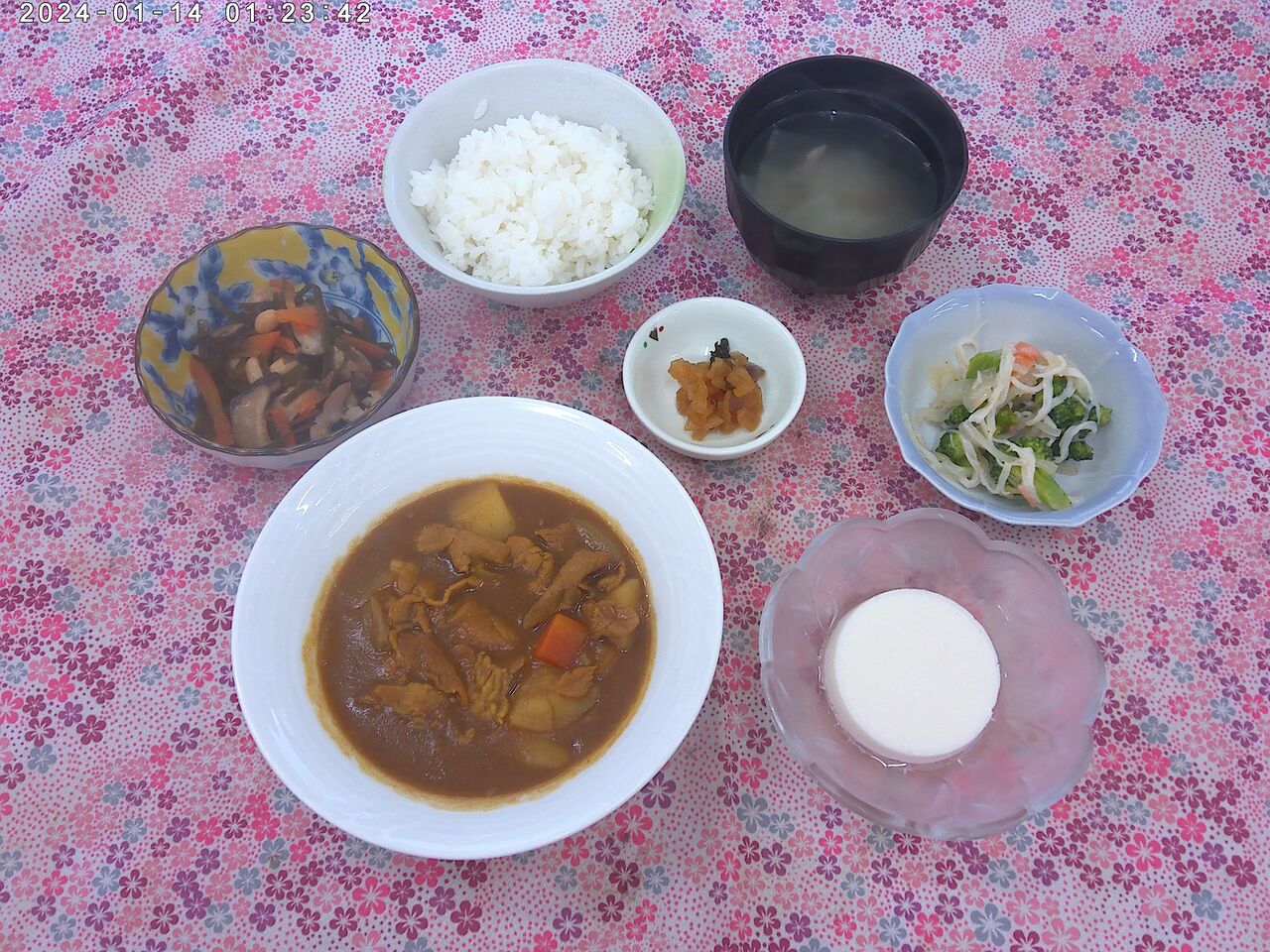 ポークカレー 2026年01月13日 ポークカレー<お昼ごはん>・ご飯 ・大根スープ ・ポークカレー ・ブロッコリーのサラダ・大豆の五目炒め煮 ・桃の杏仁豆腐 ・福神漬け※ひとこと※杏仁豆腐があることでカレーライスもぺろりと食べきることができました。大根スープも優しい味付けで美味しかったです。エネルギー:547kcal