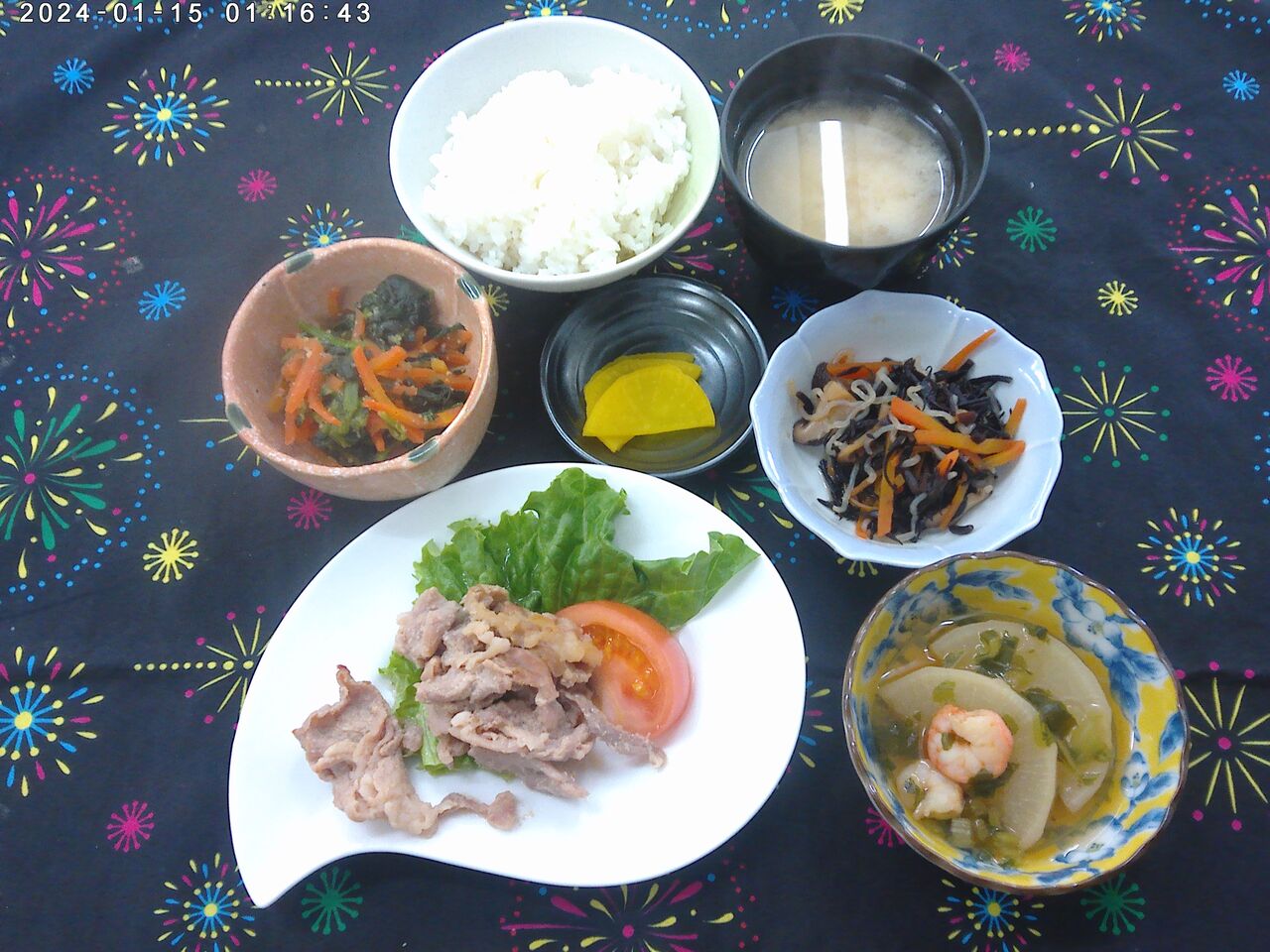 豚肉の照り焼き 2026年01月14日 豚肉の照り焼き<お昼ごはん>・ご飯 ・みそ汁(豆腐・ねぎ) ・豚肉の照り焼き ・ひじきの炒め物・大根の煮物 ・ほうれん草のピーナッツ和え ・漬物※ひとこと※豚肉の照り焼きは甘くて美味しかったです。ほうれん草のピーナッツ和えは繊維も残ることなく柔らかくて食べやすかったです。エネルギー:500kcal