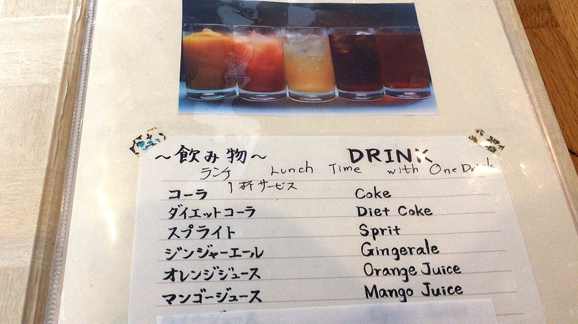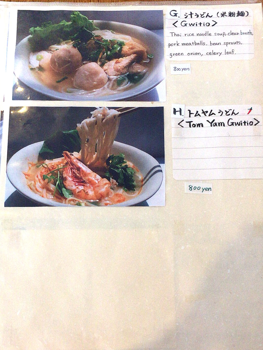 メニューの内容は予習済み。ヌードルメニューは2種類です。「汁うどん」と「トムヤムうどん」です。『うどん』と書かれていますが英語表記をよく見ると「クイティウ」と書いてあるのが分かります。「クイティウ」は周防大島の「カンボジア料理 オークン」で提供されているもので、米粉で作られた麺を使った料理です。ベトナムの「フォー」のような麺料理ですね。つまり、この2 種類の『うどん』は厳密には『うどん』ではなく、米粉のヌードルです。「トムヤムうどん」を注文しました。 2種類のうどんはドリンク付きで、この中から選ぶことができます。↓