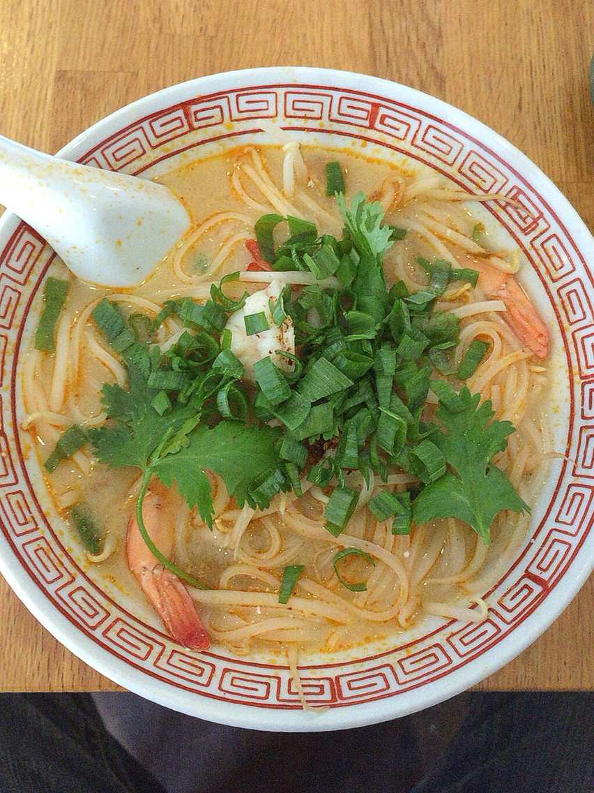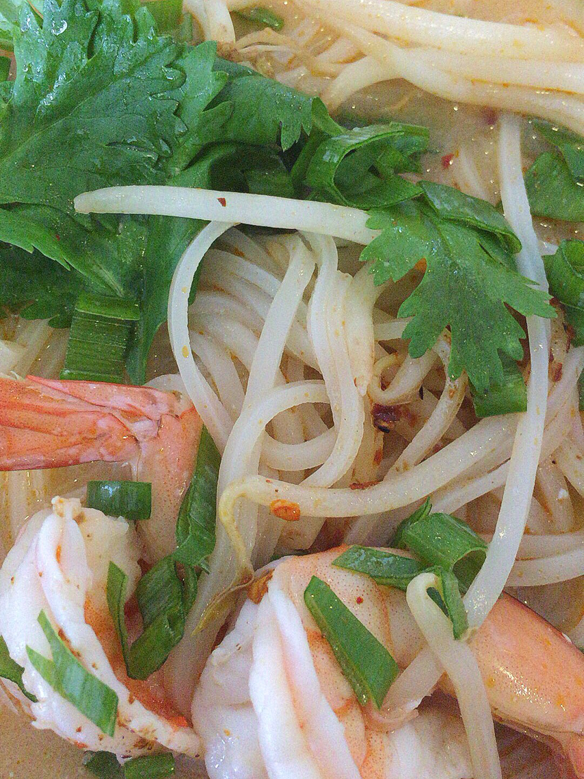 麺はやや硬めでした。茹で加減が足りない訳ではなく、こういう堅さなんだと思います。もちもち感はなく、むしろコシがある感じ。食感の方はツルツルとしています。具材は海老、もやし、ニラ、パクチーです。トムヤムクンの「クン」が海老のことらしいです。タイ料理の海老は日本料理とは違った包丁の入れ方がしてあり、頭側がめくれたような仕上がりになっています。海老は少し堅さはありますが、とても風味がよくアジアを感じさせてくれました。ココナッツでまったりとした口当たりですが、酸味で最後までさっぱりと食べられます。最後は甘酸っぱいマンゴージュースで締めました。一気飲みです。