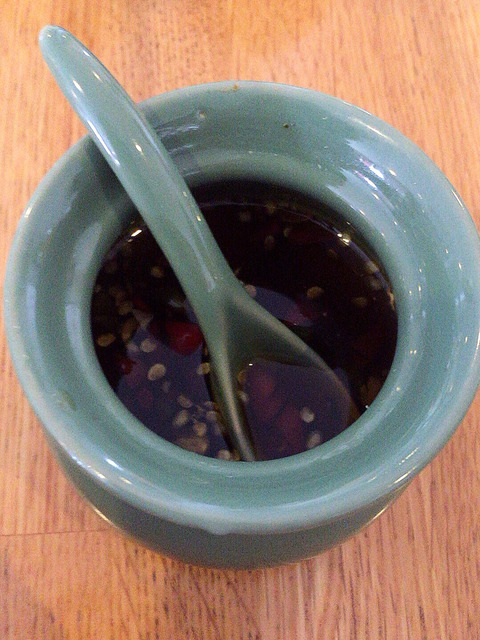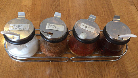「汁うどん」ほどではないと思いますが、基本の味はとてもあっさりしていて、食べる人がお好みで味を調整するシステムです。この辺りも「フォー」と同じ。4連の調味料は左から砂糖・唐辛子・酢・辣油です。別の入れ物の調味料はプリックナンプラーです。辛いタイプのナンプラーですね。