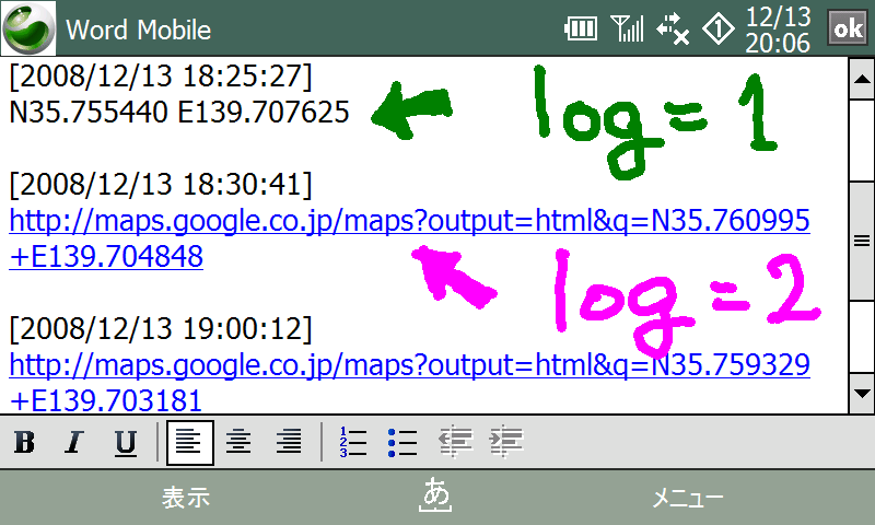 [log=1]で位置情報、[log=2]でGoogleマップ簡易HTML版で表示できるURLで出力します。[log=3]は位置情報を出力した後に終了しモバイルGoogleマップを起動しません。本当は「メールで送る」機能が、WEB版の「メールリンク」と同じく