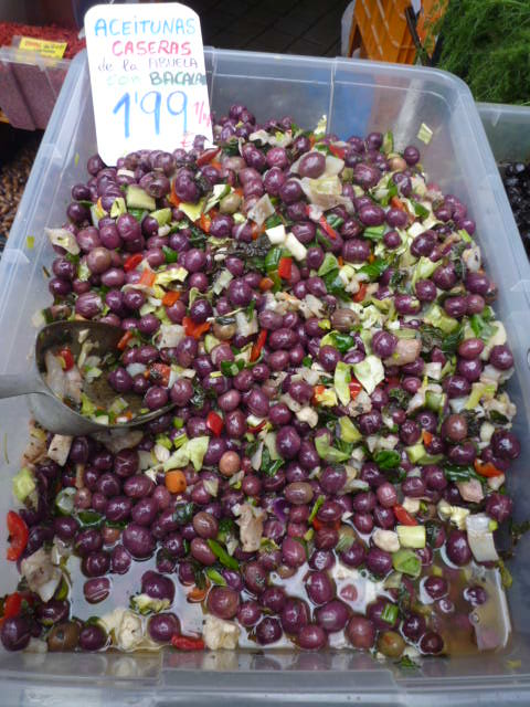 オリーブの漬物というと瓶詰めや缶詰を思い浮かべますが、スペインではあく抜きの段階から色々あり、実の熟成度や味付けなどを合わせると千差万別のオリーブ漬けがあります。日本に輸入されているのは殆んど苛性ソーダであくを抜いています。スペインでは他に塩漬けに3ヶ月ほどし、塩抜きをして味付けしているもの、水に2週間ほど晒して味付けしたもの、天日干ししたものなどがあり、それぞれ特徴のある味が楽しめます。たまたまグラナダでみつけたものは、オリーブの実が緑色から黒く変化する途中、まだ紫色の実のとき収穫し、実を割って塩漬けにし、塩抜きしたものをピーマン、タマネギと鱈、オレガノなどのスパイスと共に漬け込んだ家庭の味風のものをみつけました。やはりスペインに居るからこそ味わえるオリーブ漬けということがいえます。