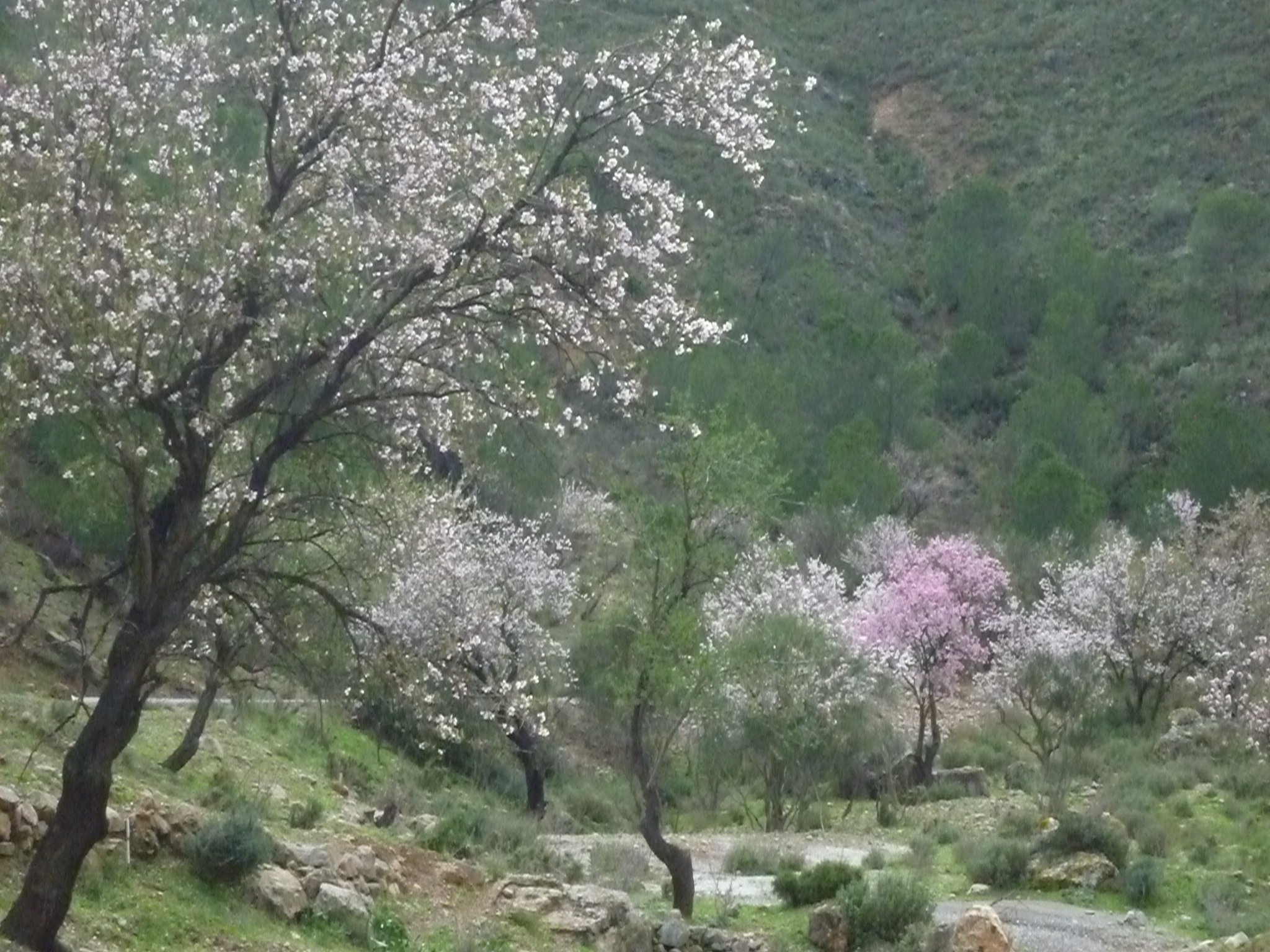 アンダルシア地方はどこもアーモンドの花に包まれています。淡い桃色の花は灰色の空に映えて美しいのですが、事態はとんでもないことになっています。いつものようにお茶を飲みにきたジョンが「大変だぞ、村から出ようにも右も左も交通遮断、崖崩れで通れないぞ!」との話、ライフラインが途絶えてしまったとのことでした。一瞬食料は大丈夫か、などとうろたえてしまいましたが、どうにかブルトーザーの出動で車が通れるようになったと、後になってききましたが、天気予報はまだまだ雨が続くとのこと、先行きが心配です。かなり昔の話ですが、フェレイローラ村の入り口にある土橋が流れ去り、一年ほど苦労したことがありました。山の生活はなにが起きるかわかりません。