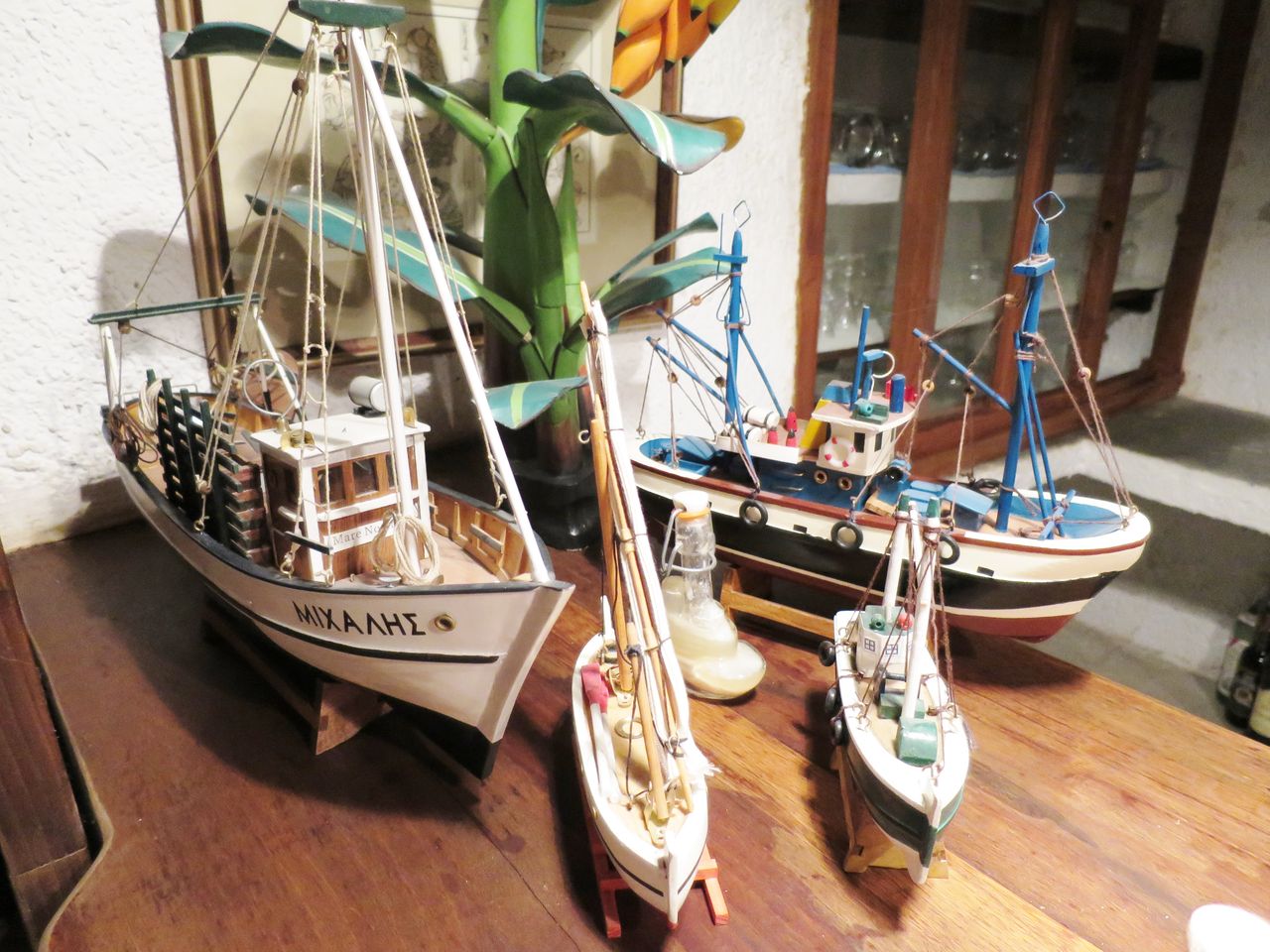 バルのカウンターには地中海のあちこちの港町で購入した漁船のミニチュアが置いてあります。スペイン、ギリシャ、トルコ、ポルトガル、そしてチュニジアです。他にスペインの北大西洋側のカツオ船もあるのですが、これは暖炉の上に置いています。こうして見ると色や舟艇の姿に美しさがあり、漁業へのこだわりが感じられます。ここで飲むお酒が更に美味しくする景色です。