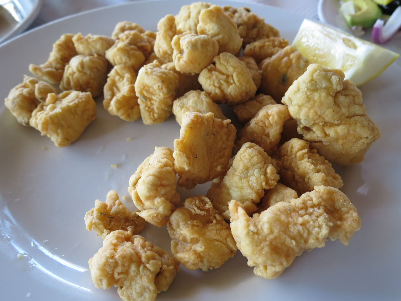 日本ではあまりお見かけしない南スペインならではの一品をご紹介します。cazon adobo, 要は鮫の肉を酢、白ワイン、香辛料」<多分オレガノやタイム>それに塩のタレ汁に漬け込んで小麦粉をまぶして揚げたものです。それにレモンを絞りかけて食べます。アンモニア臭もないし、美味しいタパになります。もっと日本でも鮫の肉が食べられると良いなと思っています。