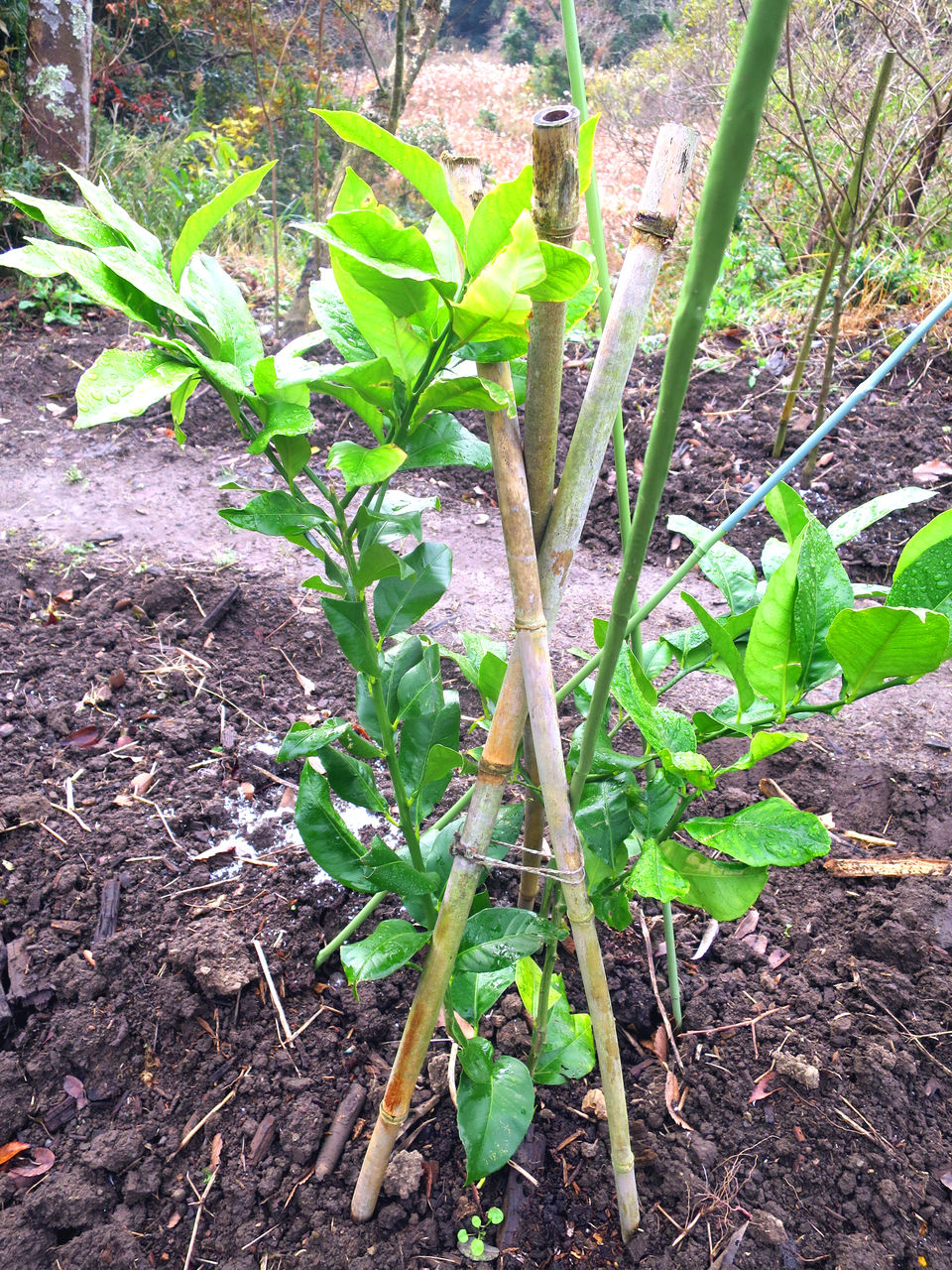 Click:南房総は黒潮のおかげで温暖、植生的には照葉樹林帯に入ります。代表的なのはマテバシイ、このあたりではトウジとも呼ばれています。ということで柑橘系も育つはずですが、やはり数日続く霜には厳しくも耐えているのが良くわかります、辛そうです。写真は柑橘類のなかでも強靭なレモンの苗なのですが、早く春が来ることを待っているように見えます。概して植物は温度より日照時間の変化に反応しています。長日性の植生は寒さのなか花を咲かせています。しかし、蜜蜂は気温15度以下では飛ぶことができないとのこと、結実することなく、あだ花になってしまうのです。2月いっぱいは、果樹と天候とのせめぎ合いが続くことでしょう。