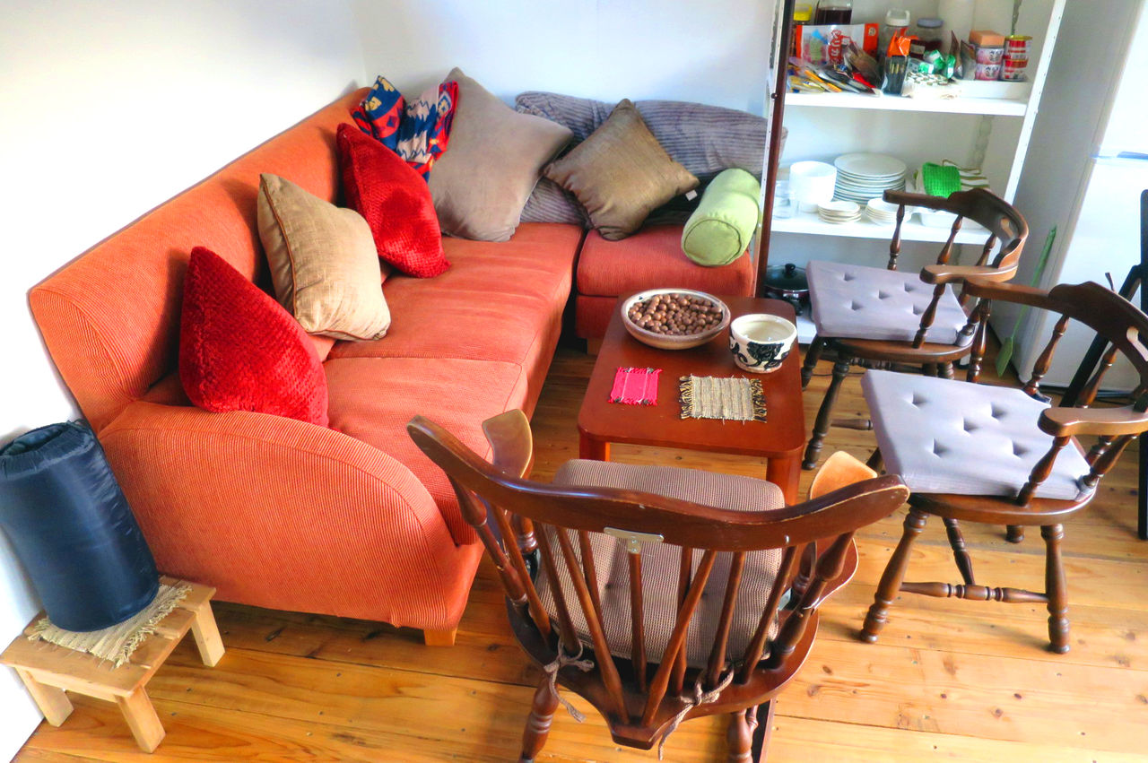 Click:秘密基地に応接セット、頂きものの椅子も加わってなかなかのものです。ここで、カフェ、気分は爽快になります。それに床・壁・天井と断熱材をしっかり使っているので、まあ、魔法瓶状態、温風機ですぐに暖かくなり、冷え難い、思ったより素晴らしい空間になっています。風に揺れる木々を見ながら、ぬくぬくとカフェを飲むのが今の極楽浄土のようです。