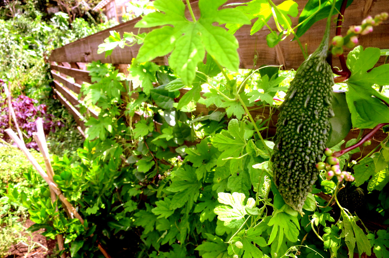 Click:蔓性の植物たちは強靭ですね、あの強風にも耐え、何もなかったかのように、やり過ごしていました。それに絡まっているのは防護柵、しっかりと作ってあります、ゴーヤもツルムラサキも一緒になって絡まり、元気にしています。実もどんどんできているし、すべては頑丈な防護柵のおかげです、イノシシからサツマイモを守り、夏野菜までも守っている姿は頼もしいのひとことです。なにが幸いするかわかりませんね。