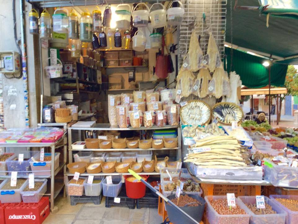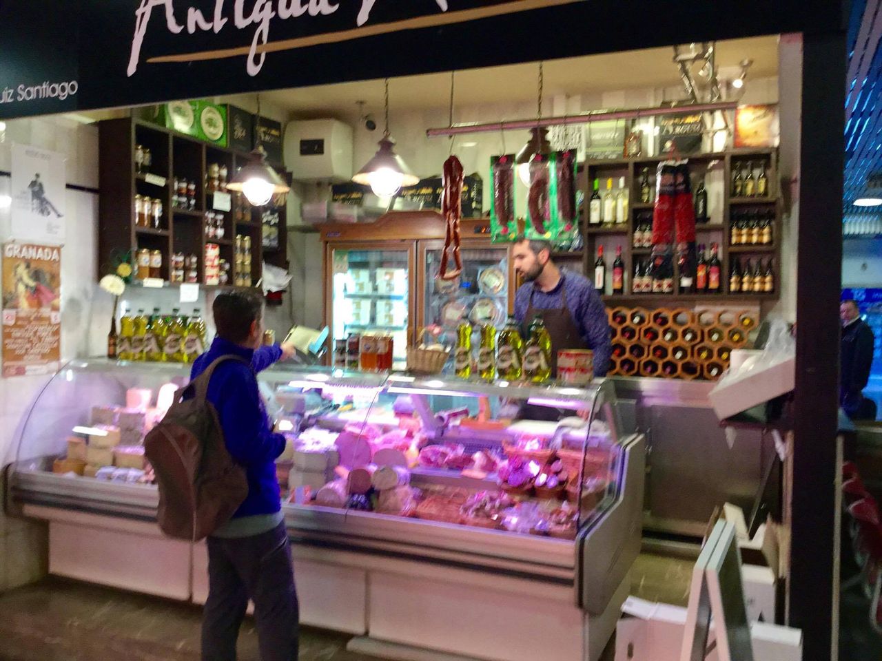 Click:グラナダの公設市場のなかにあるバル、生ハムを売りにしています。スペインでも高価なイベリコ豚のものが置いてあり、お薦めの赤ワインをセールしています。そしてなんといってもチーズ、各種置いてありますが、大体、ラマンチャ地方のマンチェーゴが主流、そして手前にはオリーブ油、スペイン人のこだわりが結晶してようなお店です。