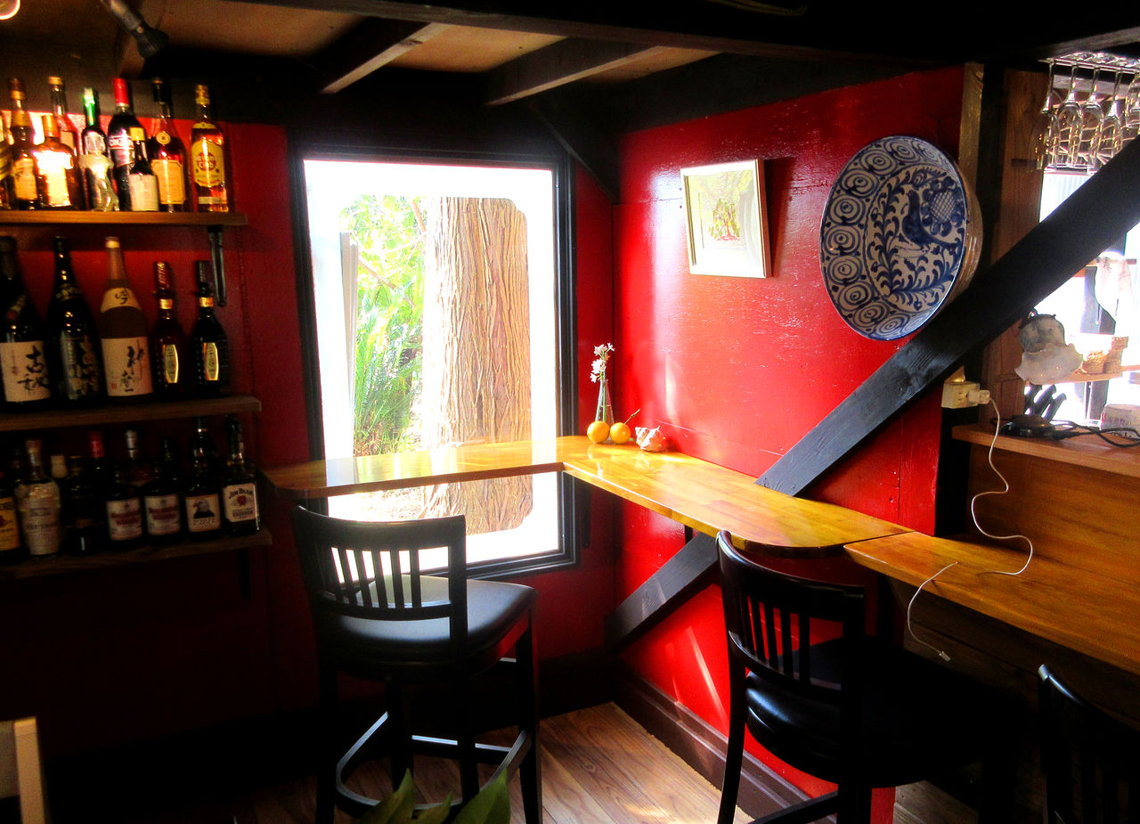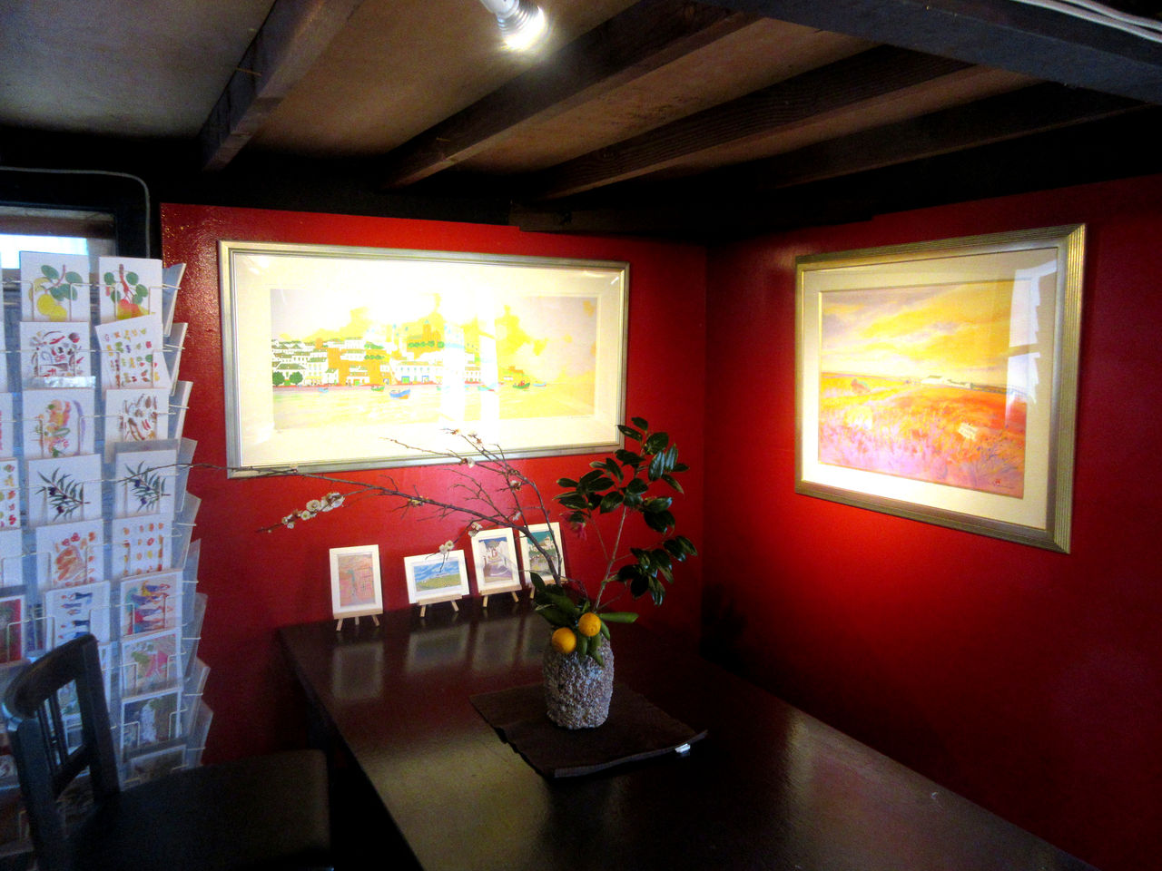 Click:スタジオの居酒屋風、壁を赤く塗ったことで心配していたことは、絵が素直に見ることができるかでした。結果は写真を見ての通り、大丈夫どころか、かえって映えてみえるのでした。それに花まで生けて遊んでみました。なんとなく居酒屋風のイメージが確立してきて嬉しい限り、あとはスペインの民芸風椅子が出来上がるのを待つばかりなのです。