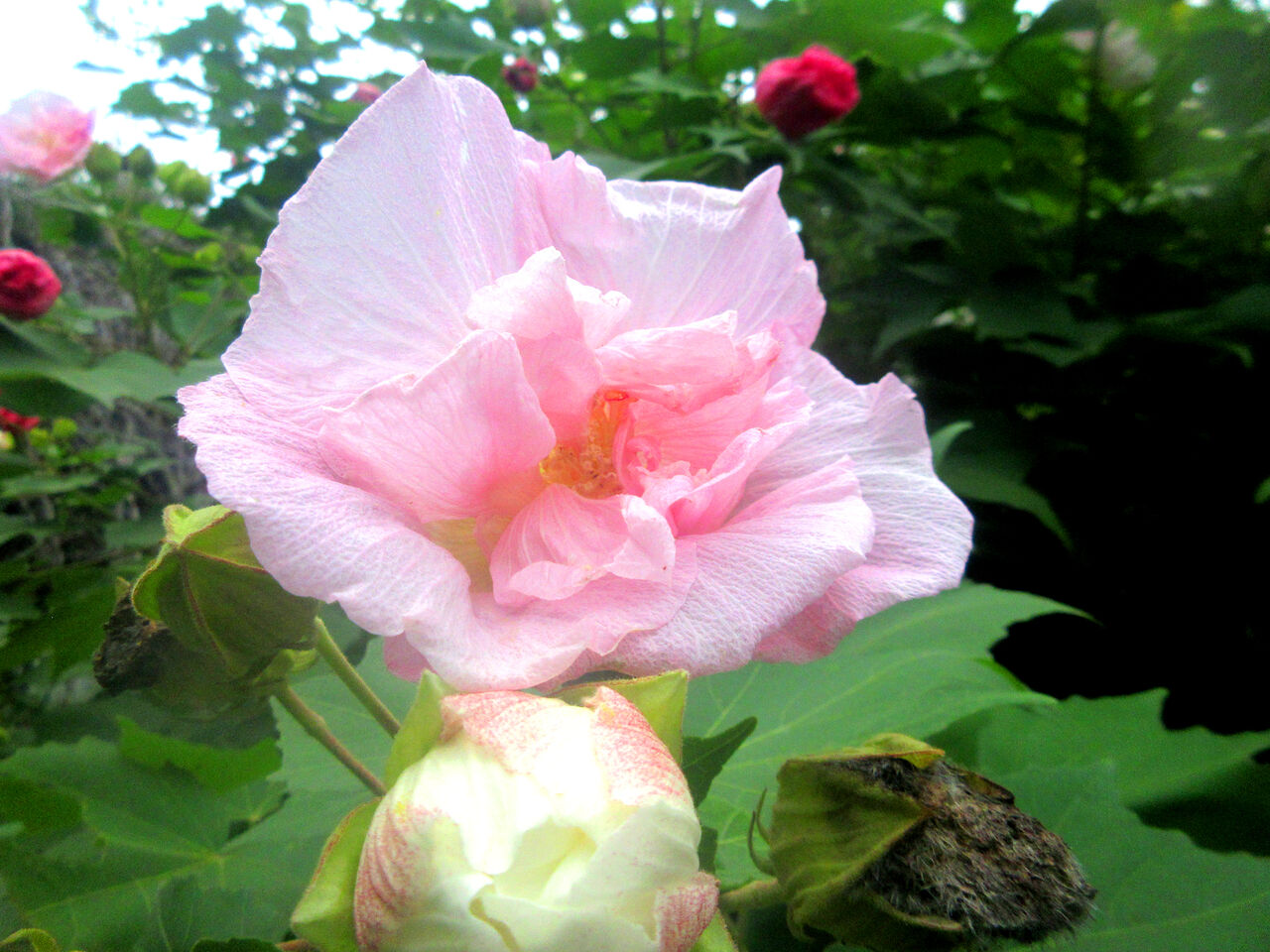 Click:アトリエの脇に大きく育った酔芙蓉があり、満開になっています。夏に大胆な強剪定をしたのですが、それにもめげず、花を沢山咲かせているのです、凄い生命力ですね!夕方になると薄桃色に染まり、なんとも艶容な姿になります、晩秋のほんの短い賑わいですね。