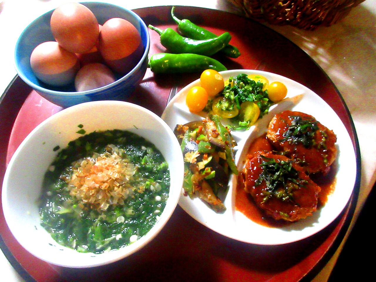 Click:無農薬、有機栽培で野菜や果物を育てていますが、なんのため?、まず皆様に差し上げること、森の住人こと動物たちに分け差し上げること、そして自分自身が食べることなのですが、なんと、気が付けばスタッフの女性が、毎回、料理してくれていました。美味しい料理と云うよりは、畑の食材をいかに使うかに重点を置いています。有り難いことですね、スタッフに感謝です。