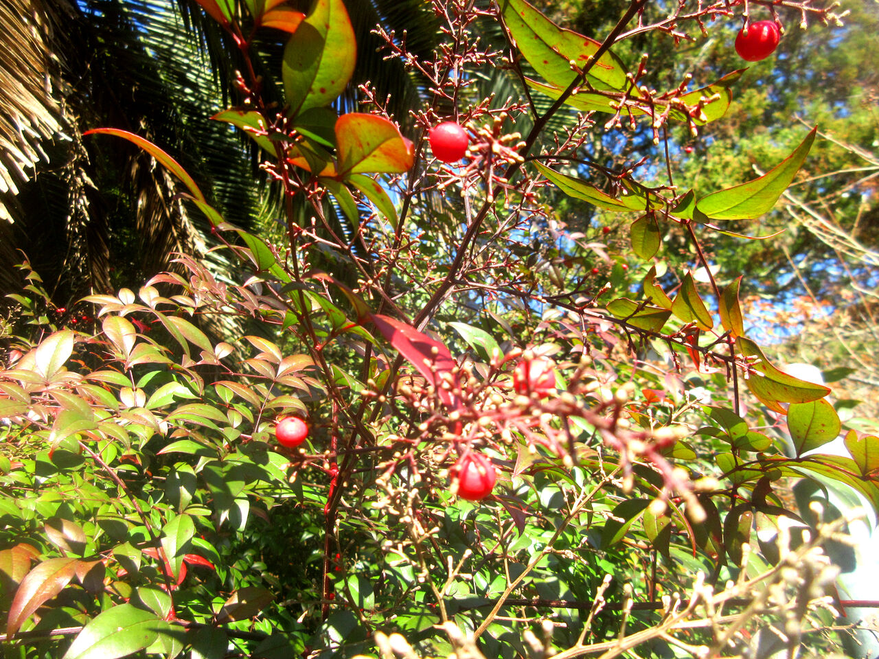Click:毎年、冬になると南天の実が沢山生るのですが、待ってましたとばかり鳥達が啄んでしまいます。写真はほんの少し残っている状態です。もう、今日には一粒も残っていないはずです。そしてビワの花に群れていたミツバチたちは梅の花に移動しています。私の敷地は鳥や昆虫たちの餌場であり、遊び場なのです。そのためにも農薬は一切使わず彼らのために、安全な環境を守っています、大事なことですよね。