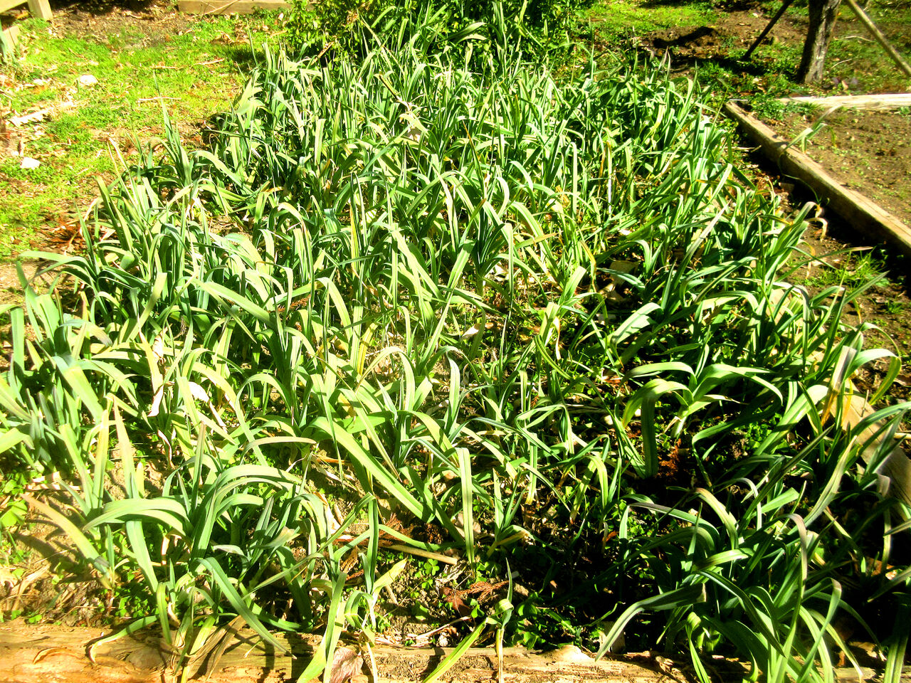 Click:畑の野菜群のなかで今、一番元気なのがジャンボニンニクです。寒さも何のその、元気に育っています。どうもニンニクと呼ばれていますが、リークの仲間、匂いもしないし、なにかと料理しやすいのです。オーブンで焼いて食べるのが簡単で美味しい。そろそろ収穫しますかね?