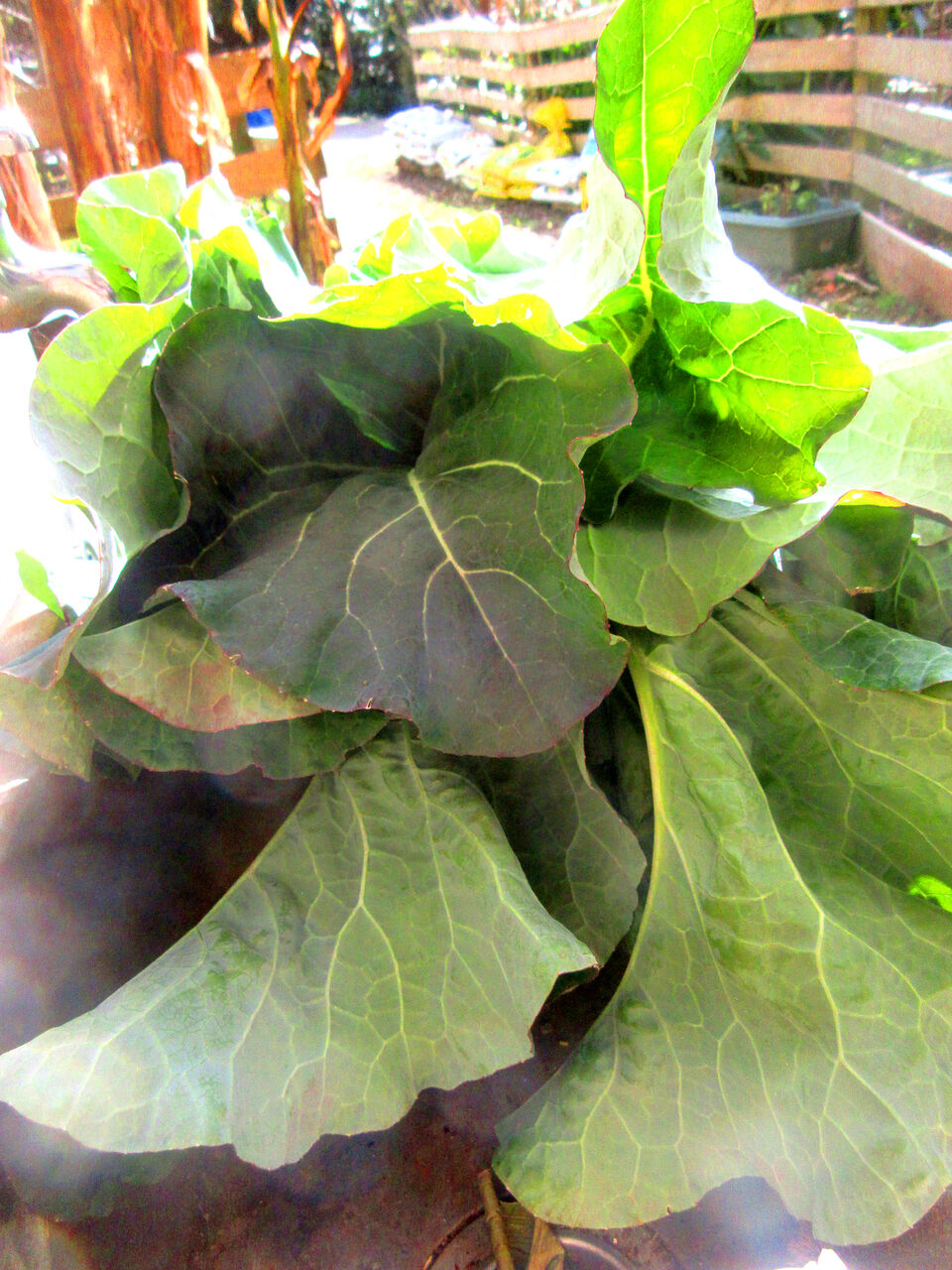 Click:お隣さんからのコッコチャン達へのプレゼント、カリフラワーの外葉です。これが大好きなのです。常食はふすまやトウモロコシなどの飼料なのですが、運動場に放すと草を食んでいます。そんなときに大ご馳走の葉っぱをあげると勢いよく集まってきます。有り難いお届け物なのです。