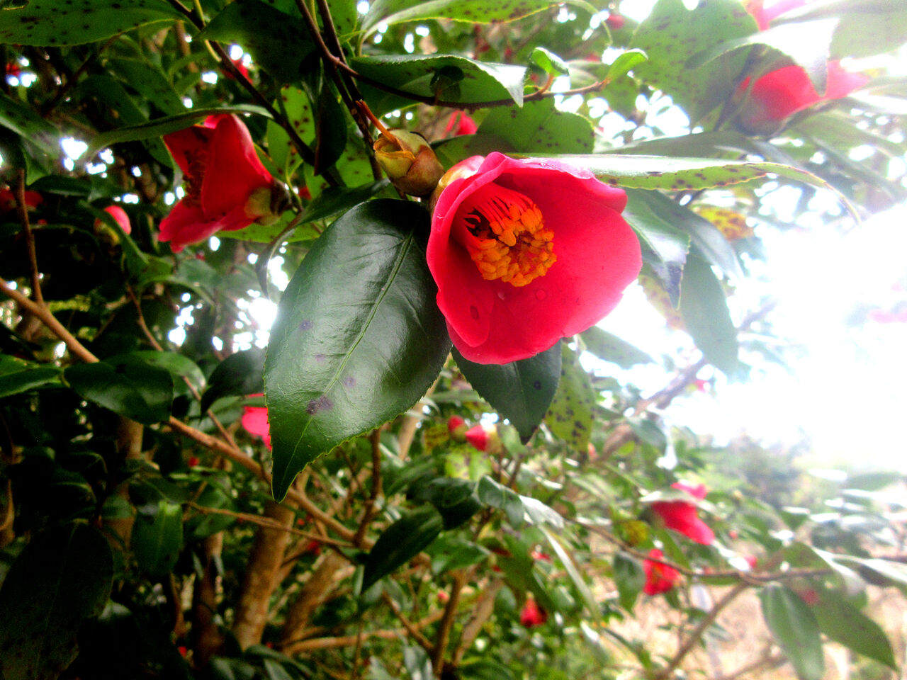 Click:このところ急に暖かくなりましたね、それに寒い日も続いたし、植物の開花ホルモンが促されたようです、藪椿が満開になりました。真っ赤な色、やはり自然の中では目立ちますね。それにミツバチたちもブンブンと群れているし、メジロやヒヨドリまでもが集まってきています。花は植物と動物たちの仲立ちをしているのですね、しかし、イノシシ君はまたぞろミミズを求めてやってきています、昨日はその後始末をしていました。