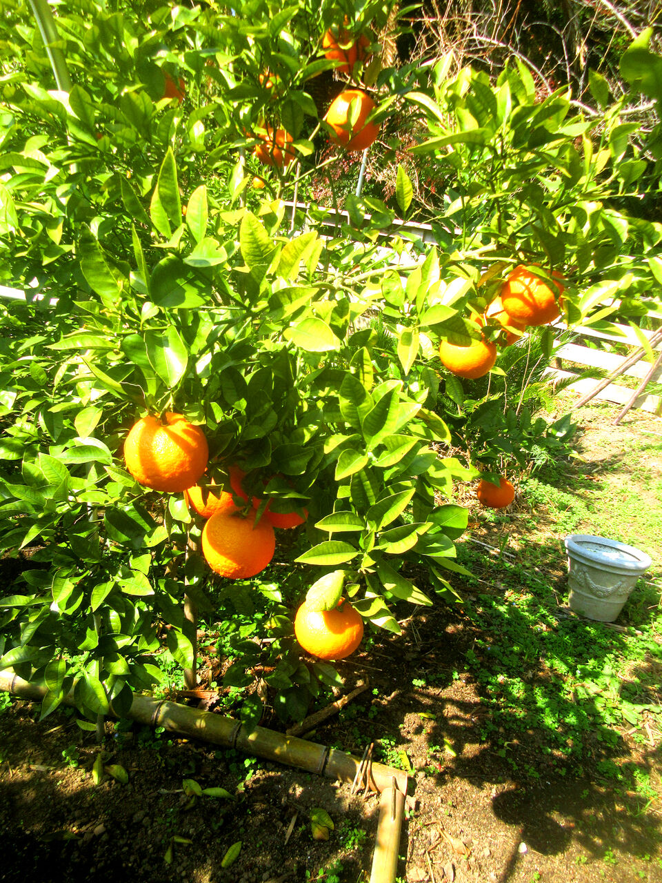 Click:最後になりそうな柑橘類が色鮮やかに輝いています、ダイダイです。毎年、ジャムにしていましたが、今年は紅甘夏で大量に作ったので、さて、どうしましょうです。スタッフの友人が果汁を搾り、ポン酢にしているようです。よかったら差し上げようと考えています。あとは甘夏系のフレッシュサマーが残っています。柑橘類は甘い蜜柑やポンカンなどはサル軍団に食べられてしまいますが、皮の厚い物は残り、私たちが利用できるのが嬉しいですね。