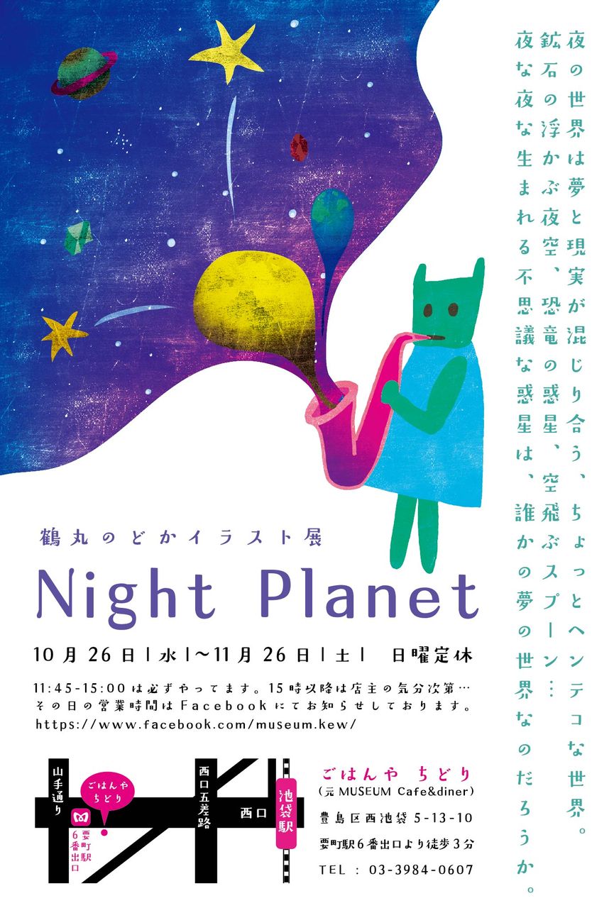 もう来週になりますが、10月26日より池袋のカフェ『ごはんや ちどり』さんにてイラスト展を行います。