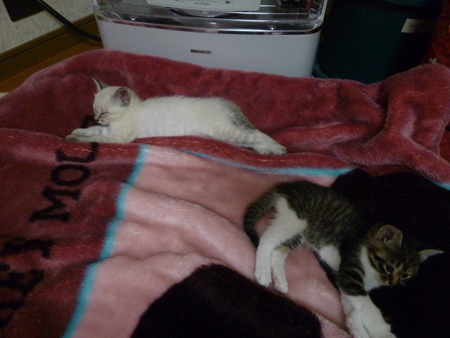 ご飯もいっぱい食べて、ストーブ前で寛ぐ、サクラとハル。