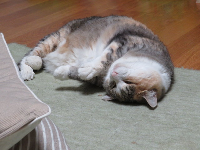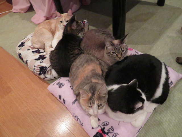 夜中(ちょっと手前?)に起きたら、まだ涼しいからか5猫団子ができていました