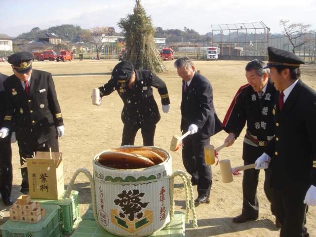 市町村合併により、昨年から八女消防本部・八女市消防団・八女市立花消防団3団体合同の出初式です。