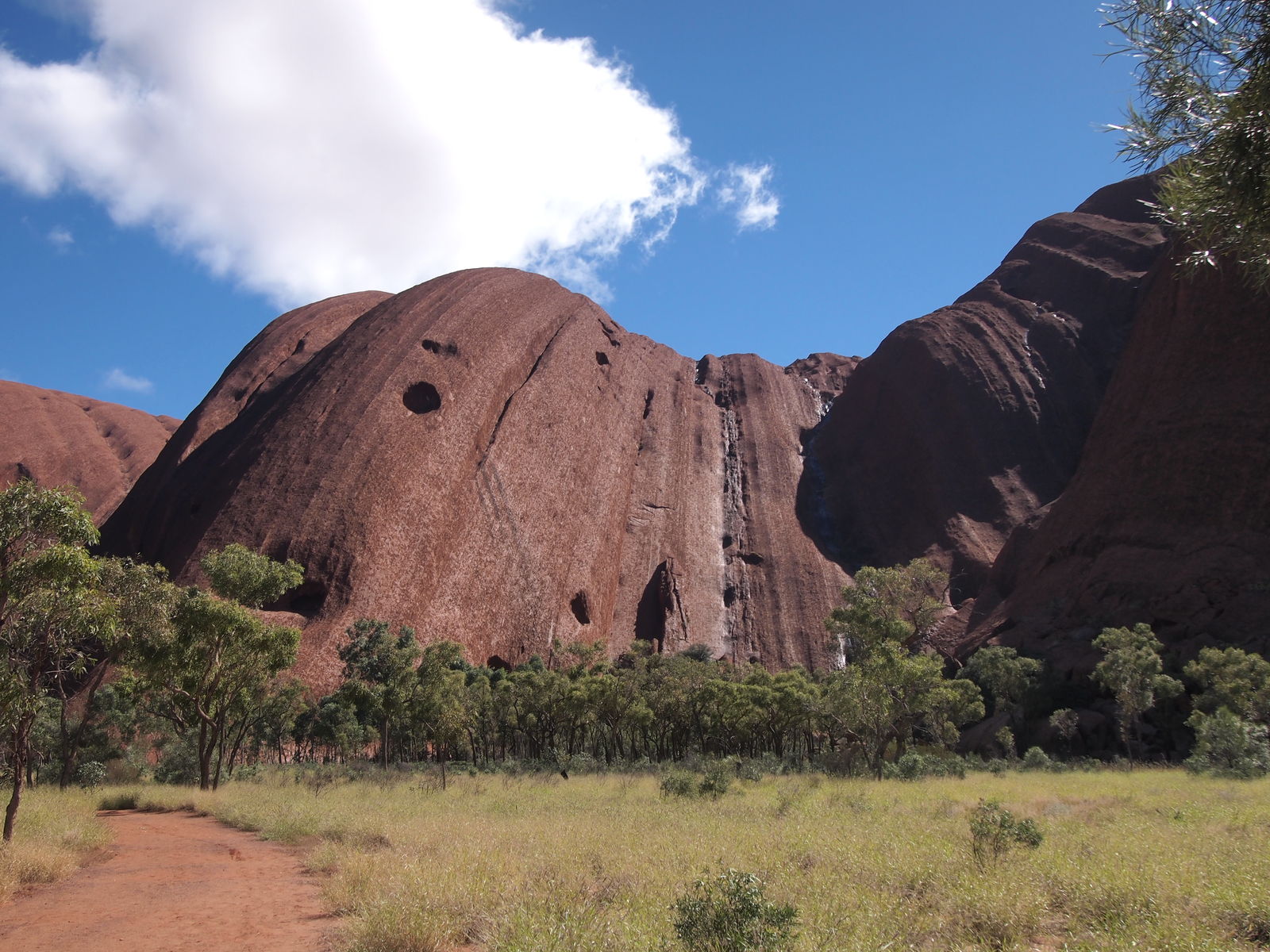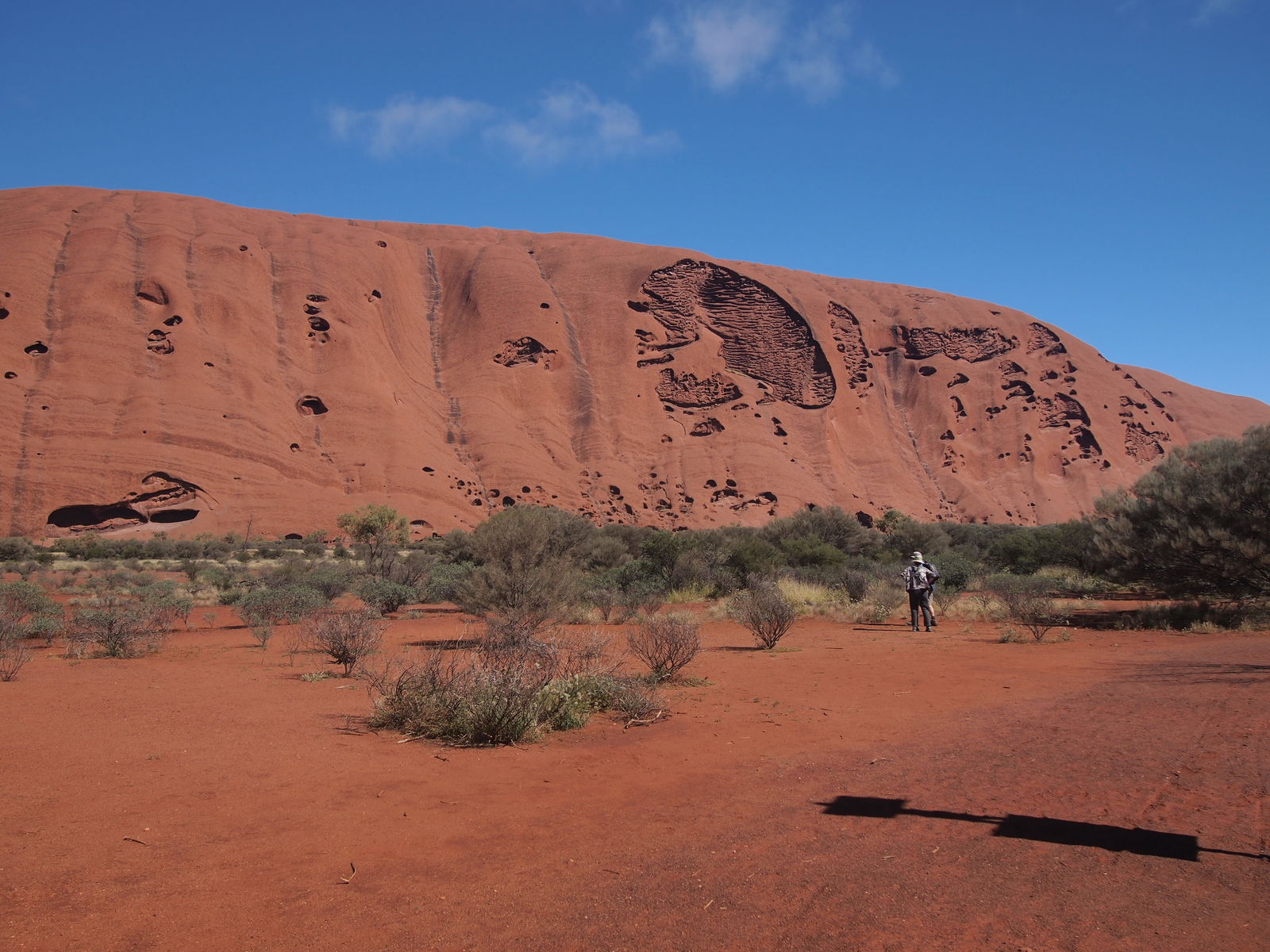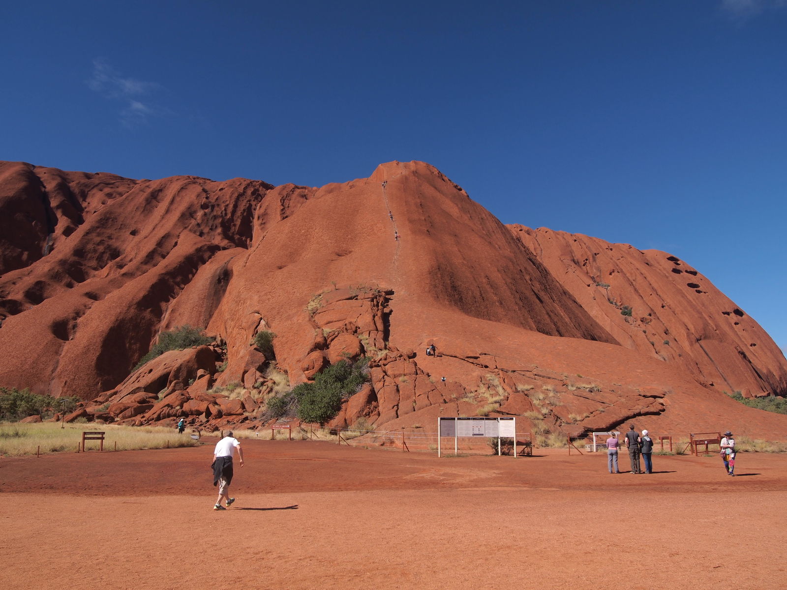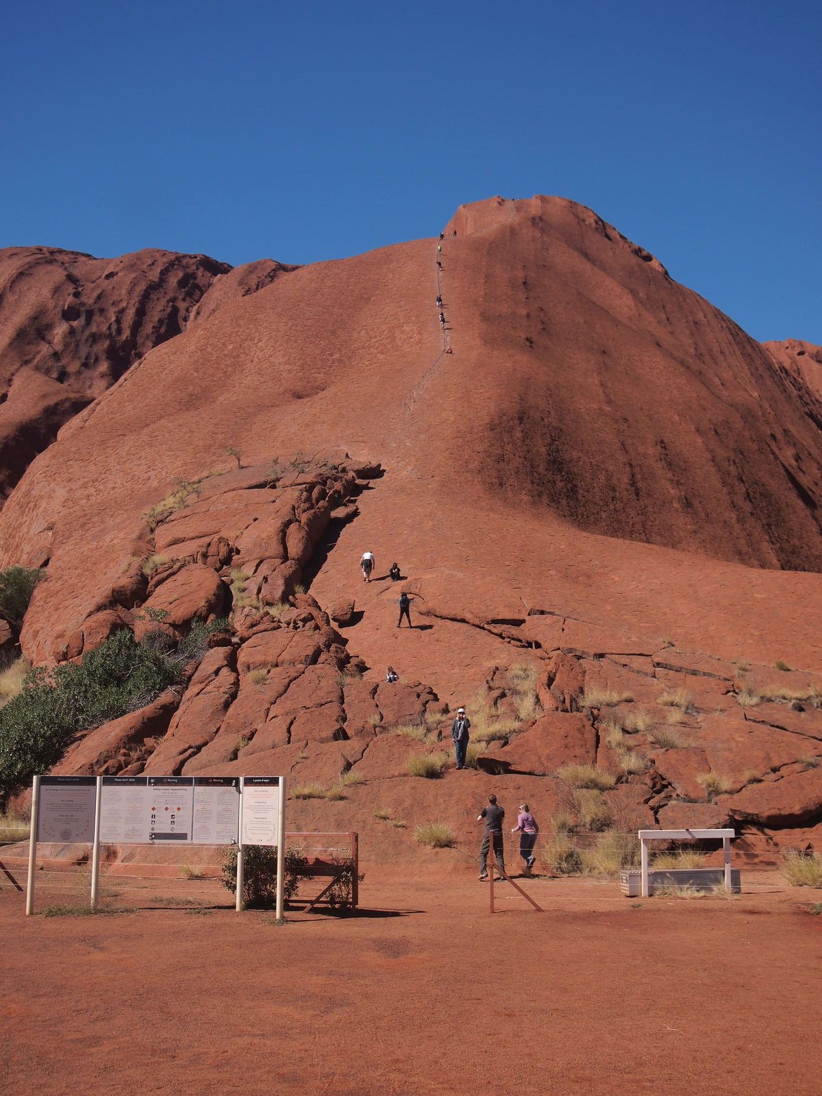 高さ約300mほどの巨大な一枚岩で、その日の気温と降水確率次第では上まで登ることも可能。なお夏の時期は99%登ることはできず、登頂許可が下りるのは大体冬の時期に限られる。私が訪れた時には運良く許可が下りていたのだが、現地の人たちが信仰の対象としているウルルを登ることは止めてほしい・・・と思っていることから遠慮しておいた。気にせずガンガン登っている人もいるけれど。