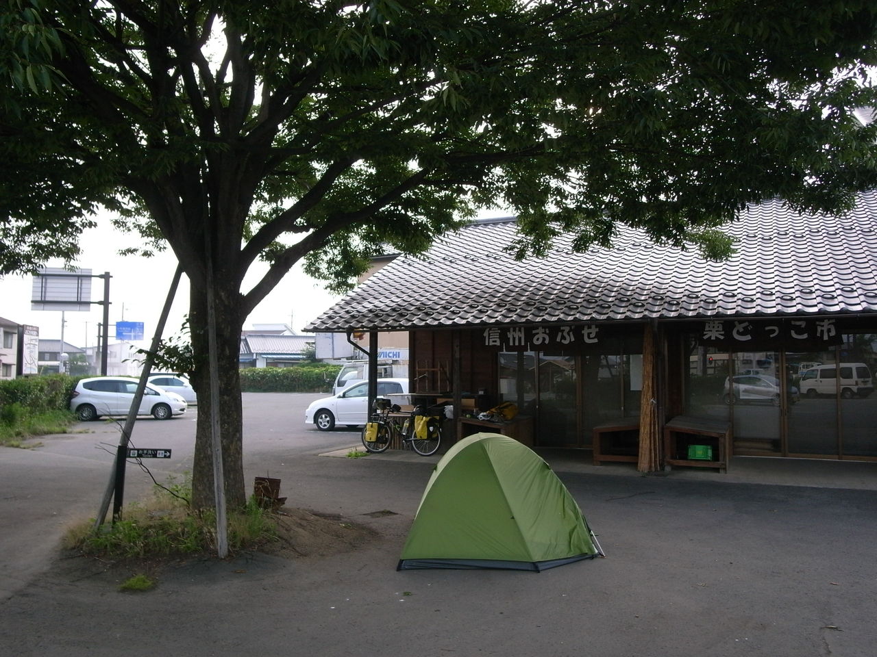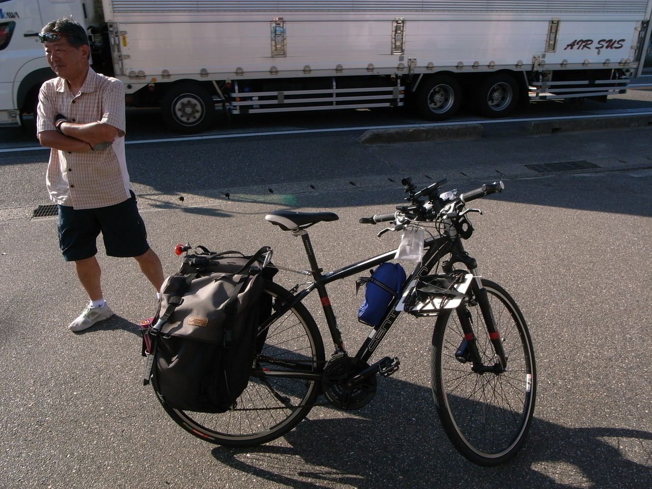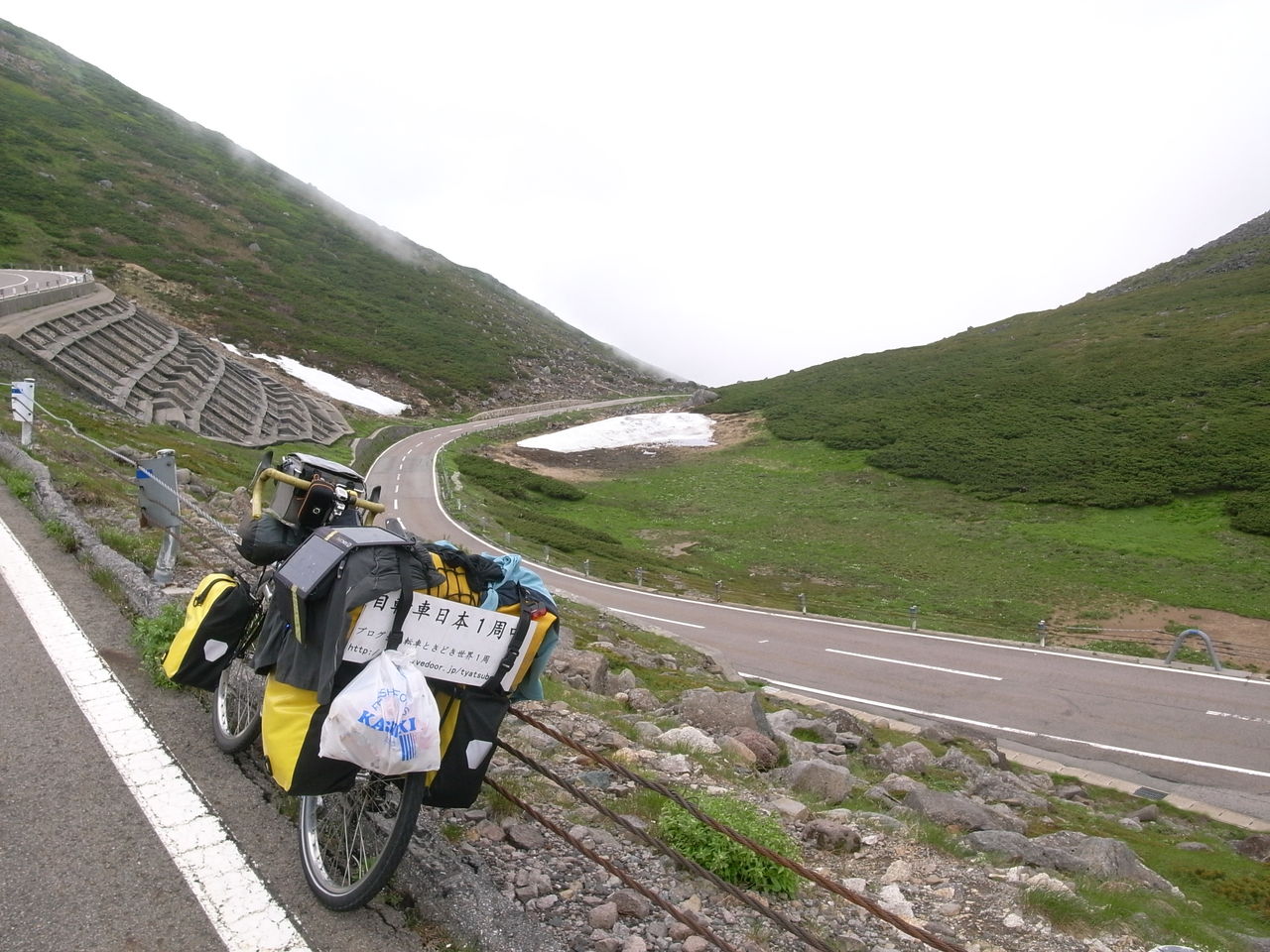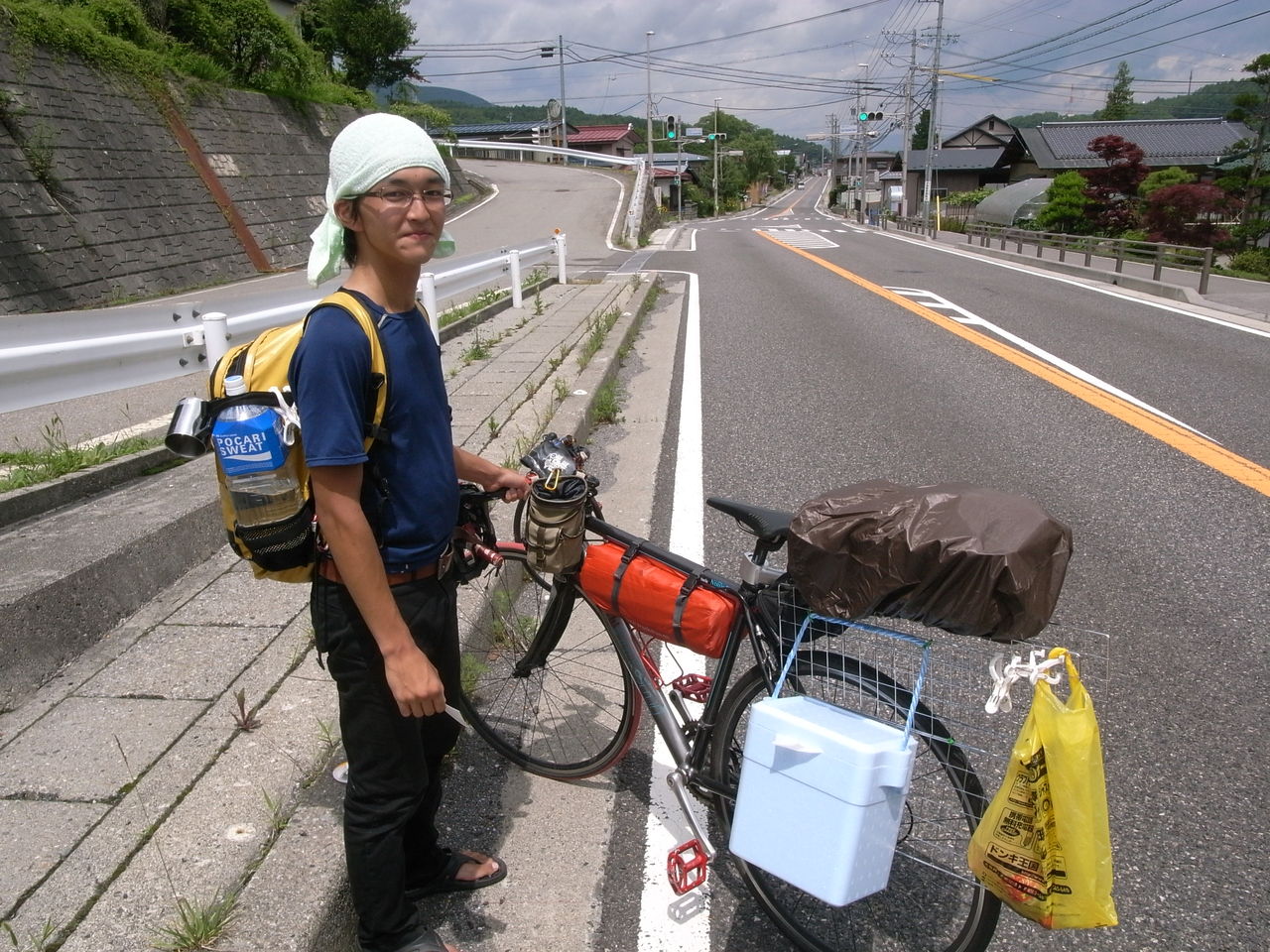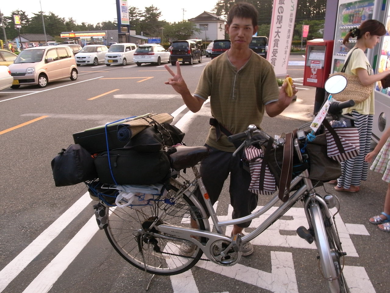 厳しい条件の中で140km以上の走行を走行した後、道の駅に到着。疲れた疲れたと自転車を止めると隣に止まっている自転車には「日本1周中」の文字が。というか何だか見たことある気がする自転車だなぁ・・・と思ったら、大分県ですれ違ったママチャリ日本1周の人だった!